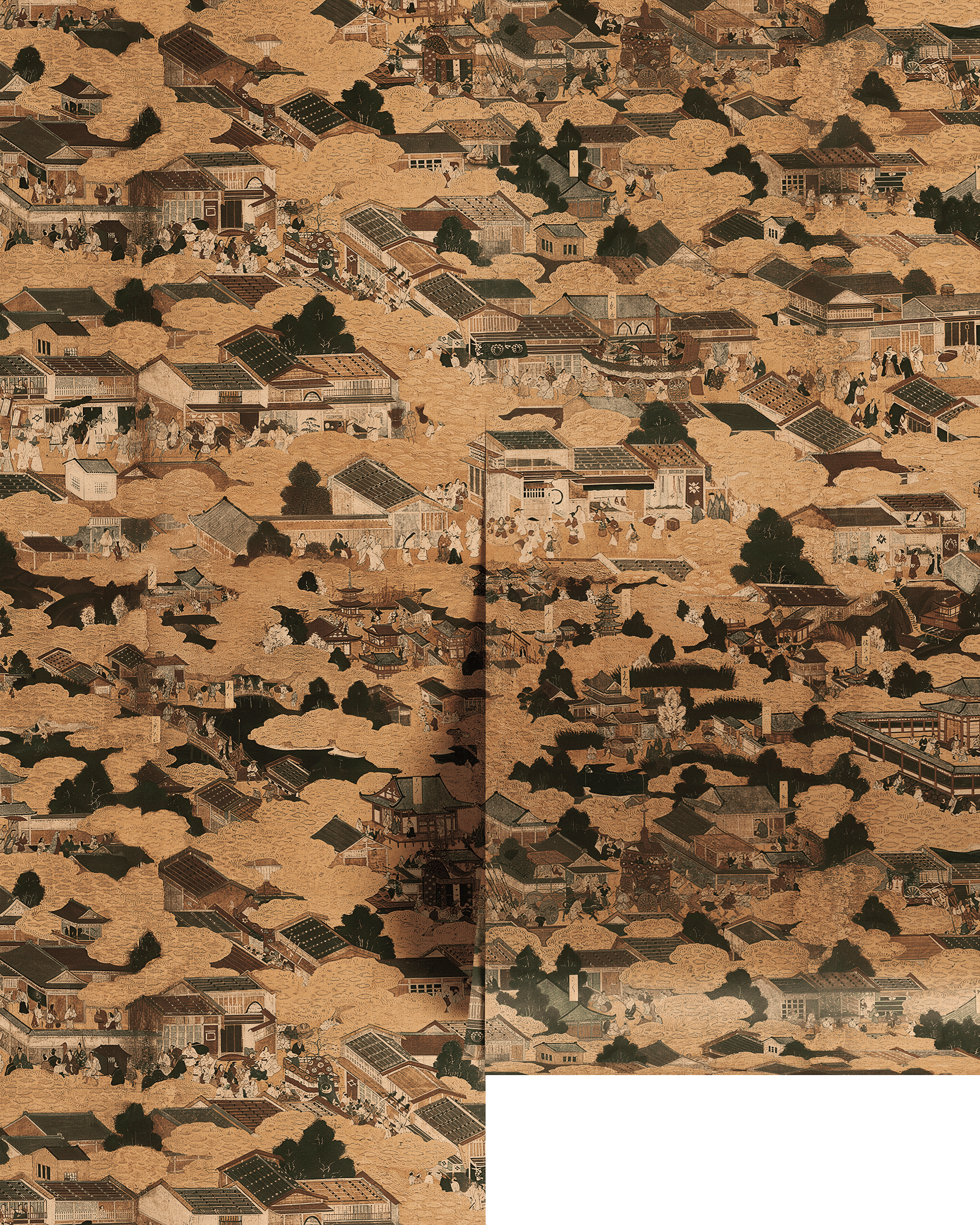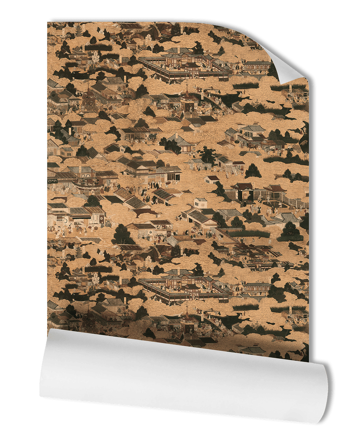 An ethereal landscape of rooftops and trees unfolds in quiet rhythm, capturing the layered charm of bustling Edo-period Japan. Edo Village Wallpaper invites you to wander through a floating world of temple eaves, lively courtyards, and mist-draped gardens — each shimmering vignette a story etched in time.