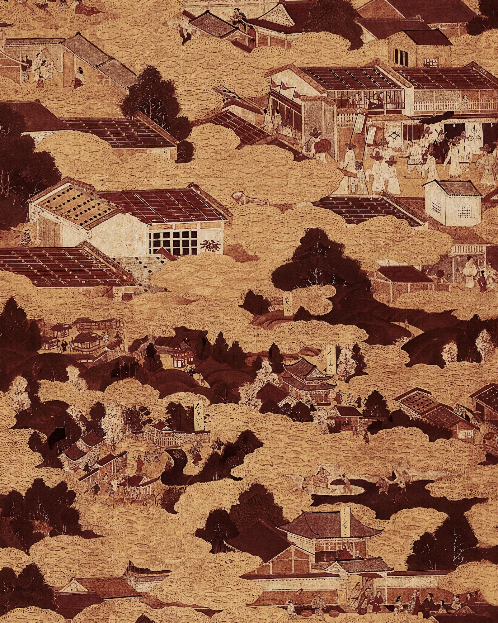 An ethereal landscape of rooftops and trees unfolds in quiet rhythm, capturing the layered charm of bustling Edo-period Japan. Edo Village Wallpaper invites you to wander through a floating world of temple eaves, lively courtyards, and mist-draped gardens — each shimmering vignette a story etched in time.