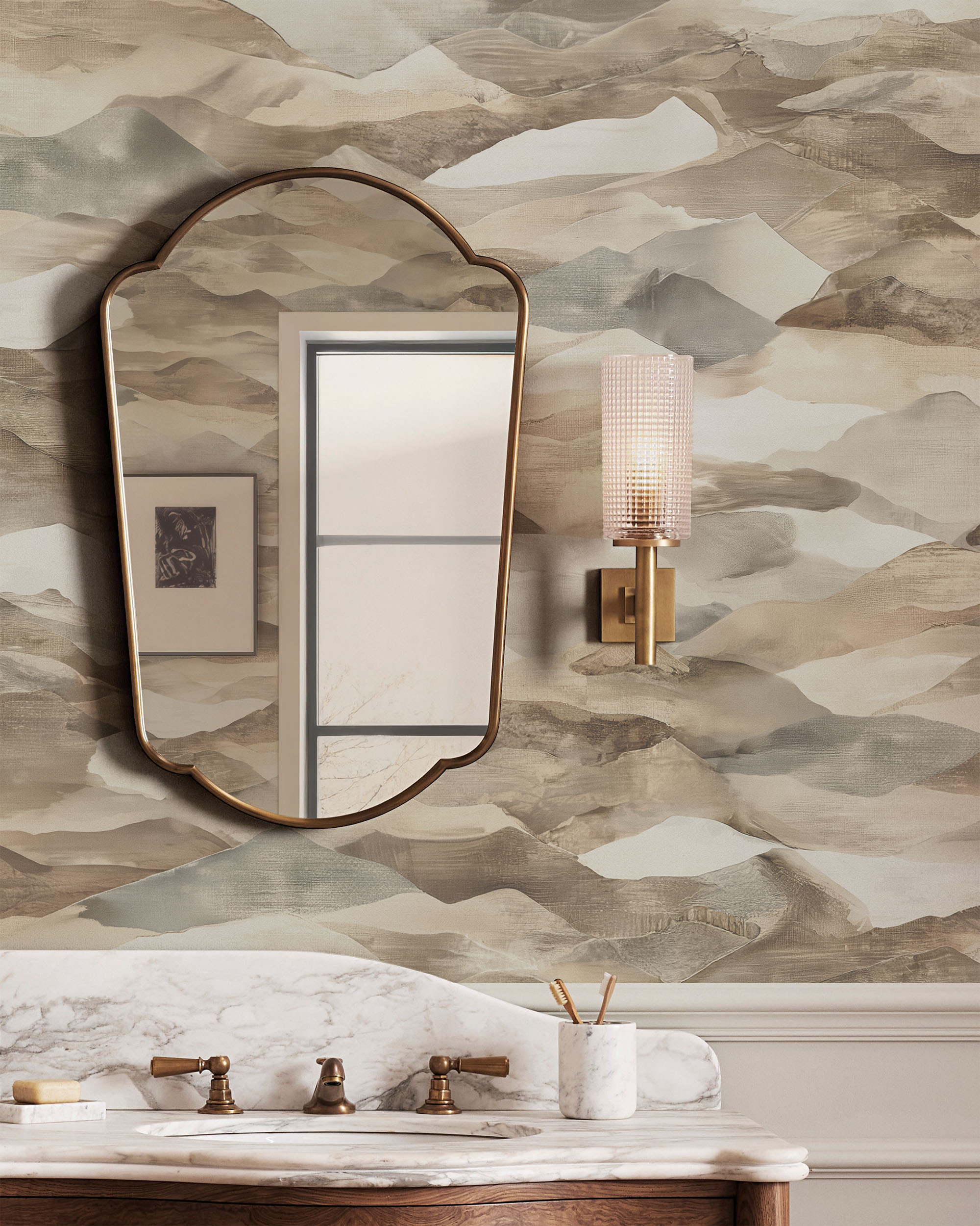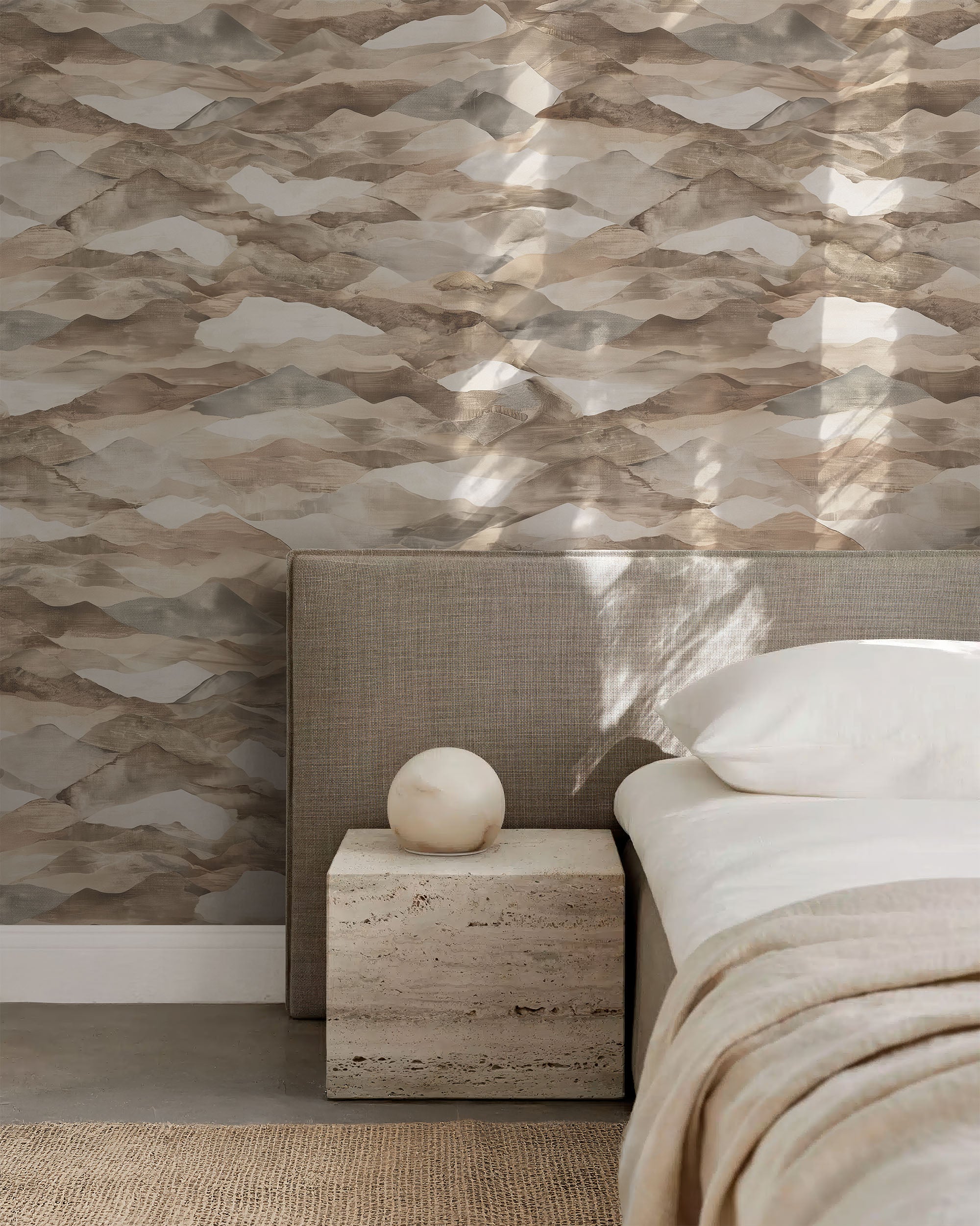 Terra Wallpaper evokes the mystique of misty mountains and the vastness of desert landscapes, enveloping your space in a serene atmosphere. Create an elevated interior that seamlessly blends earthy, organic elements with the untamed beauty of the outdoors.