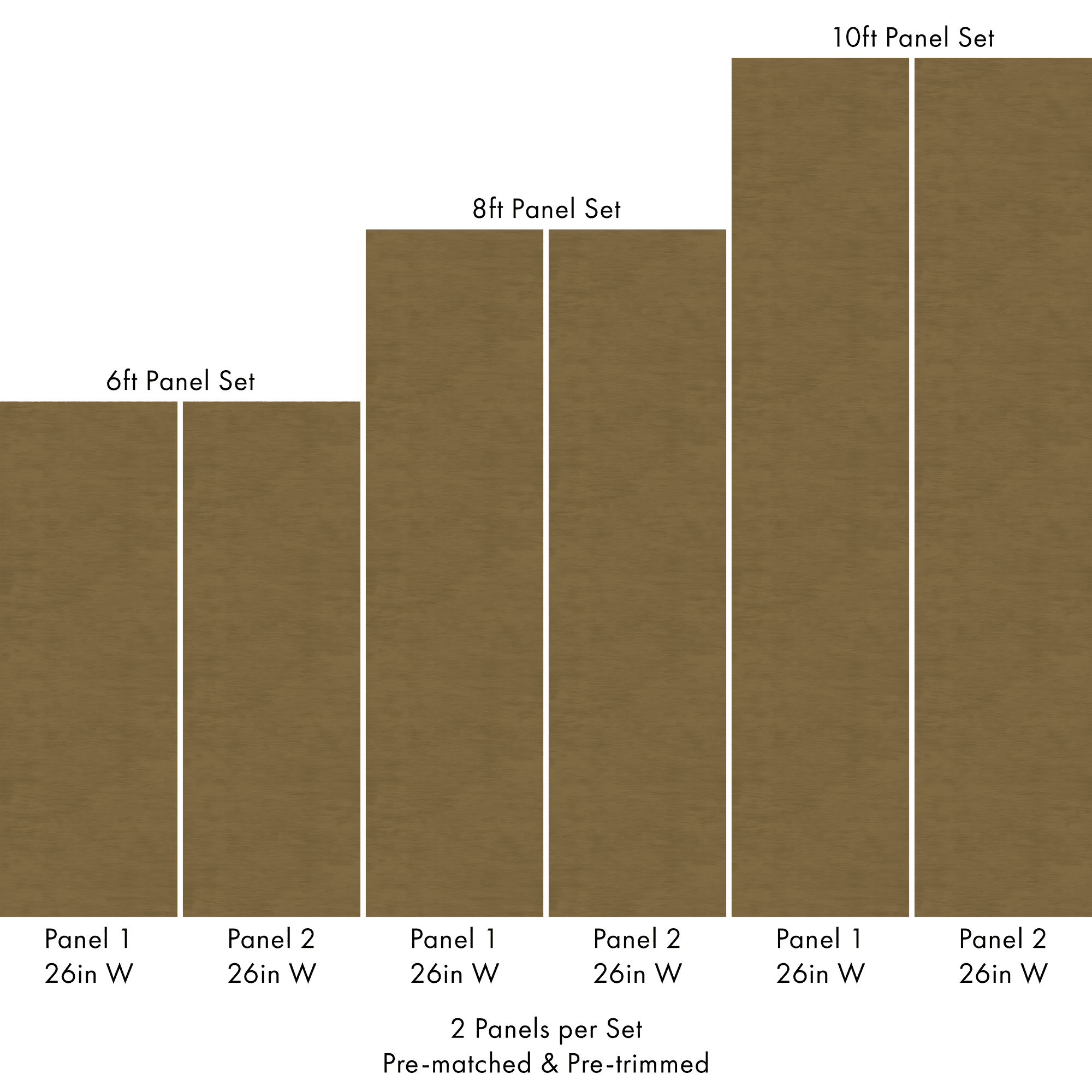 Each order includes 2 pre-matched, pre-trimmed panels designed for a seamless installation. Panels measure 26 inches wide and are available in 6 ft, 8 ft, or 10 ft lengths. For custom sizing, please contact us.