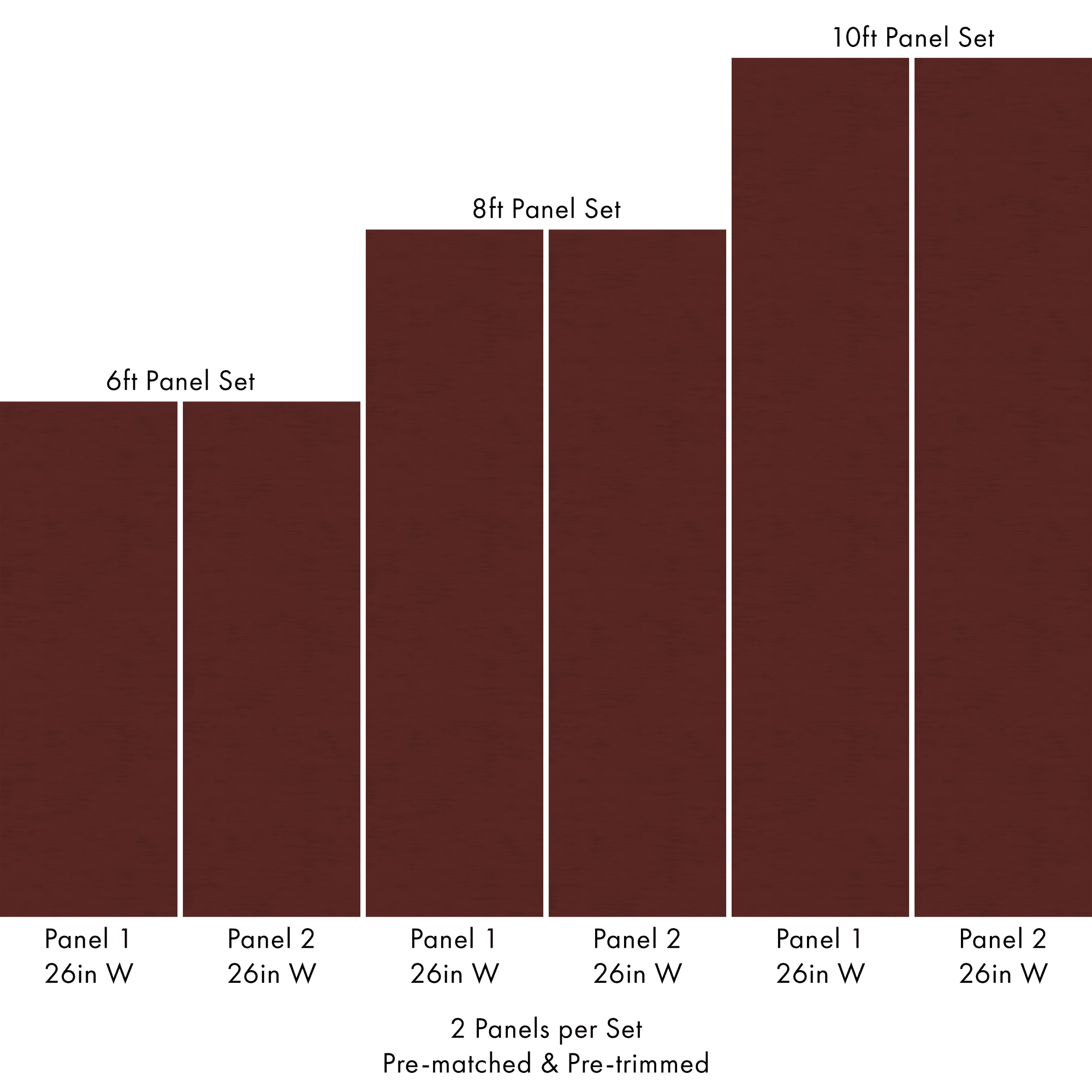 Each order includes 2 pre-matched, pre-trimmed panels designed for a seamless installation. Panels measure 26 inches wide and are available in 6 ft, 8 ft, or 10 ft lengths. For custom sizing, please contact us.