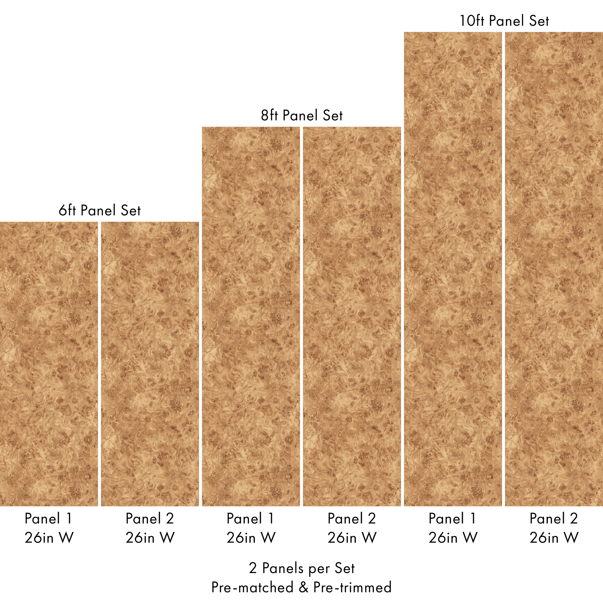 Each set includes 2 pre-matched and pre-trimmed panels designed for a seamless installation. Panels measure 26 inches wide and are available in 6 ft, 8 ft, or 10 ft lengths. For custom sizing, please contact us.