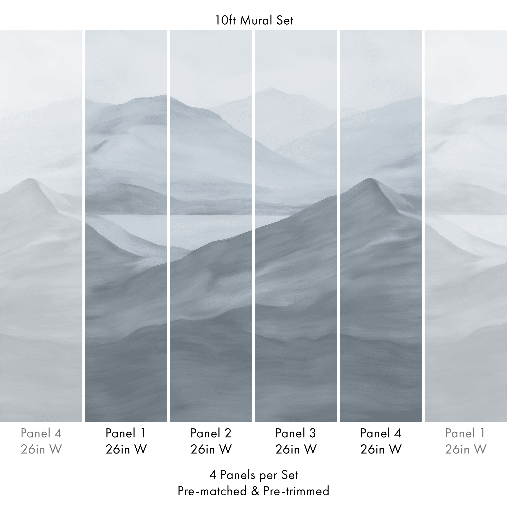 This mural is produced and sold in a pre-matched & pre-trimmed 4-panel set. Total mural width 104in (264cm).