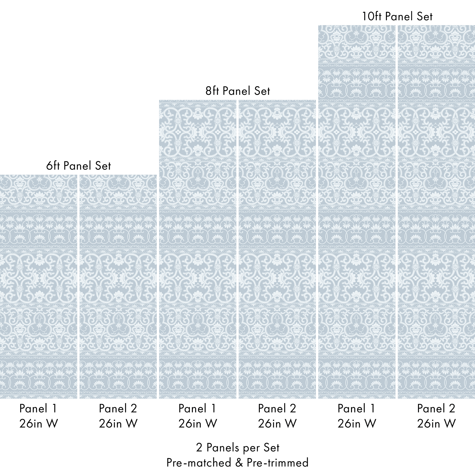 Each set includes 2 pre-matched and pre-trimmed panels designed for a seamless installation. Panels measure 26 inches wide and are available in 6 ft, 8 ft, or 10 ft lengths. For custom sizing, please contact us.