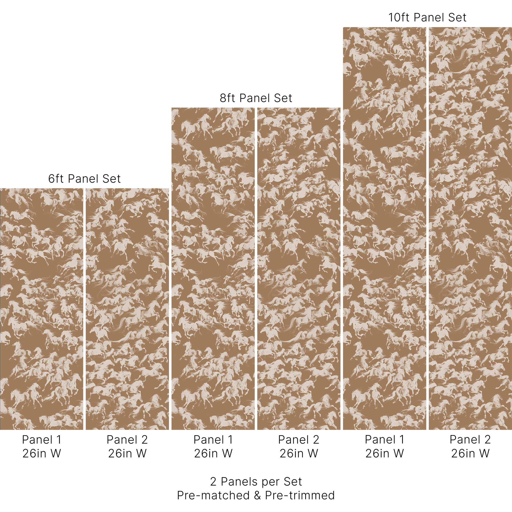 Mustang Wallpaper showcases rich, hand-painted watercolor patterns that beautifully embody the untamed mystique of a herd of wild horses. Organic brushstrokes are inspired by the unbridled spirit found in the western frontier, infusing spaces with a sense of movement and mood.