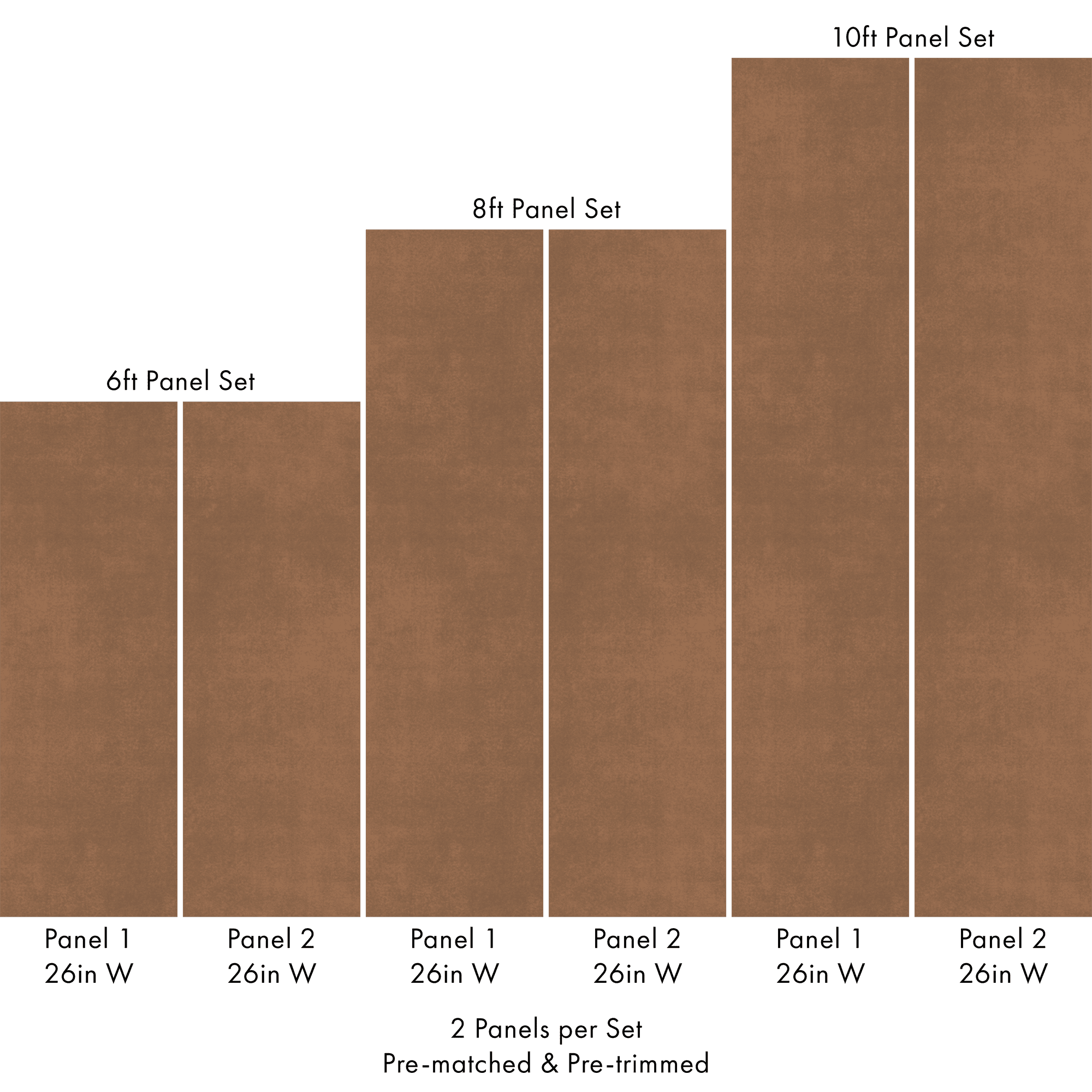 Each order includes 2 pre-matched, pre-trimmed panels designed for a seamless installation. Panels measure 26 inches wide and are available in 6 ft, 8 ft, or 10 ft lengths. For custom sizing, please contact us.