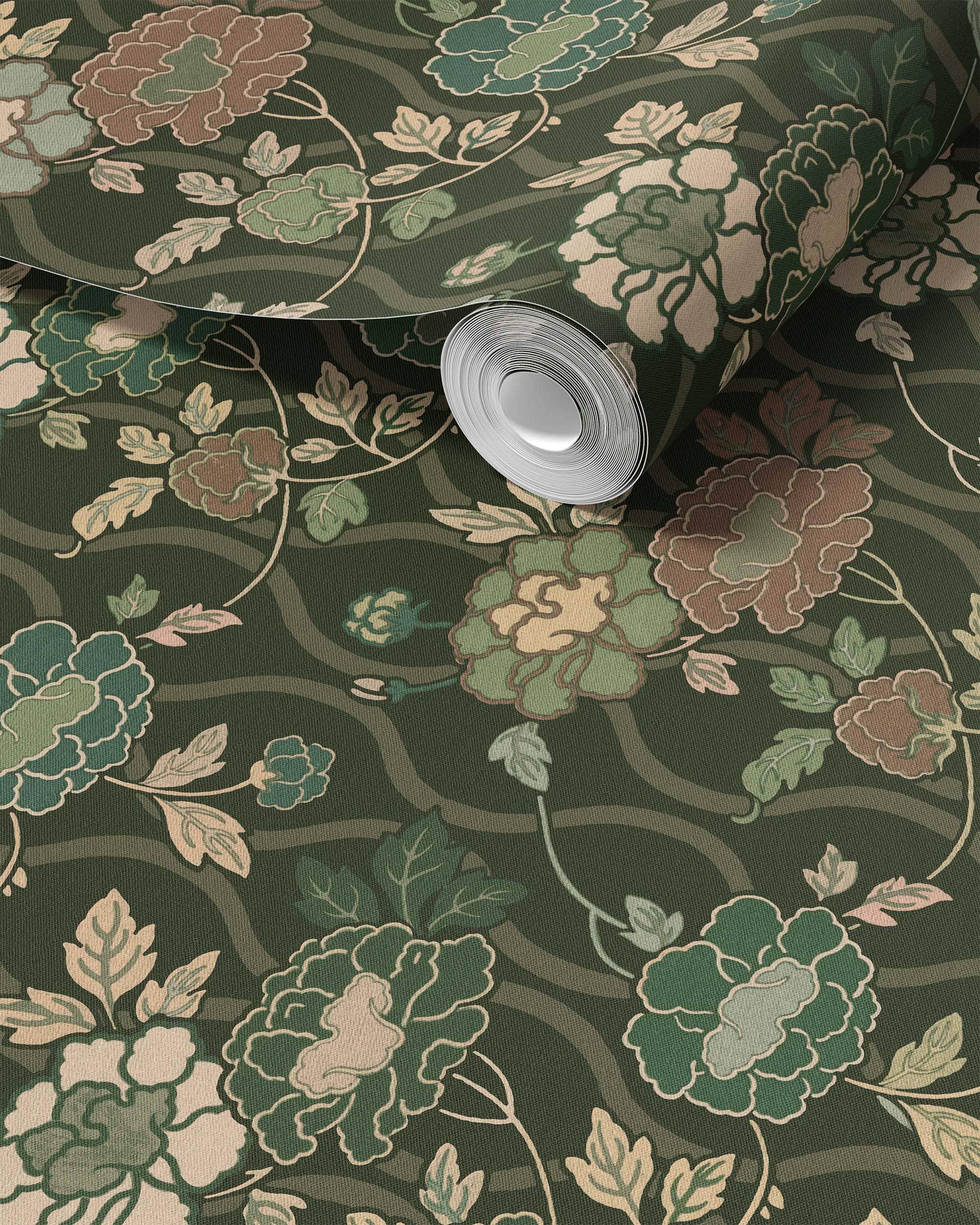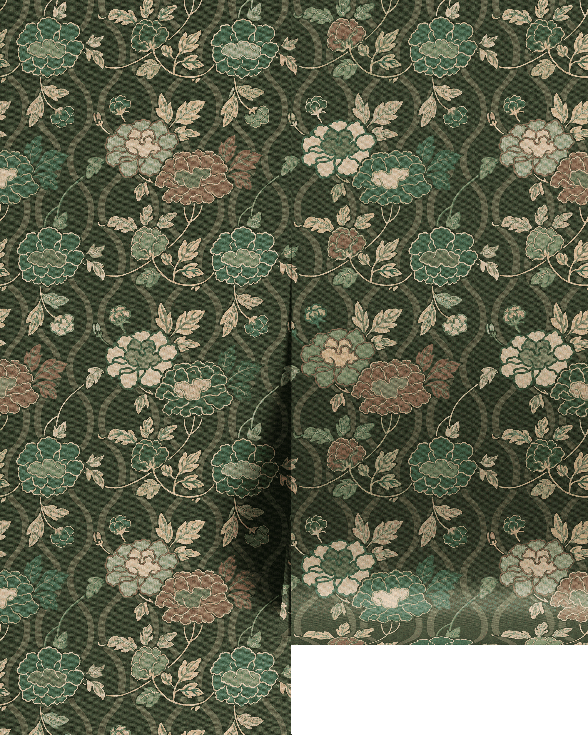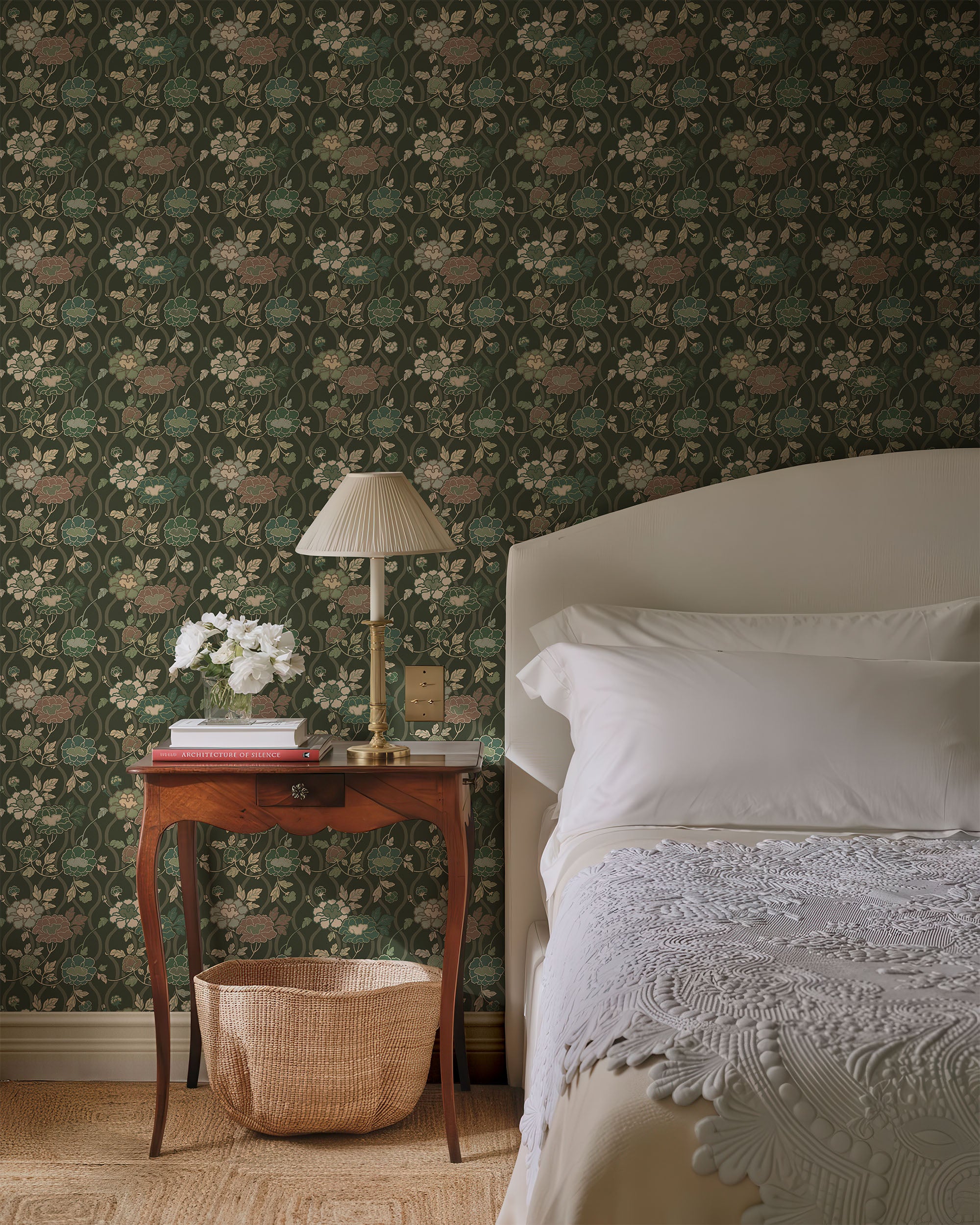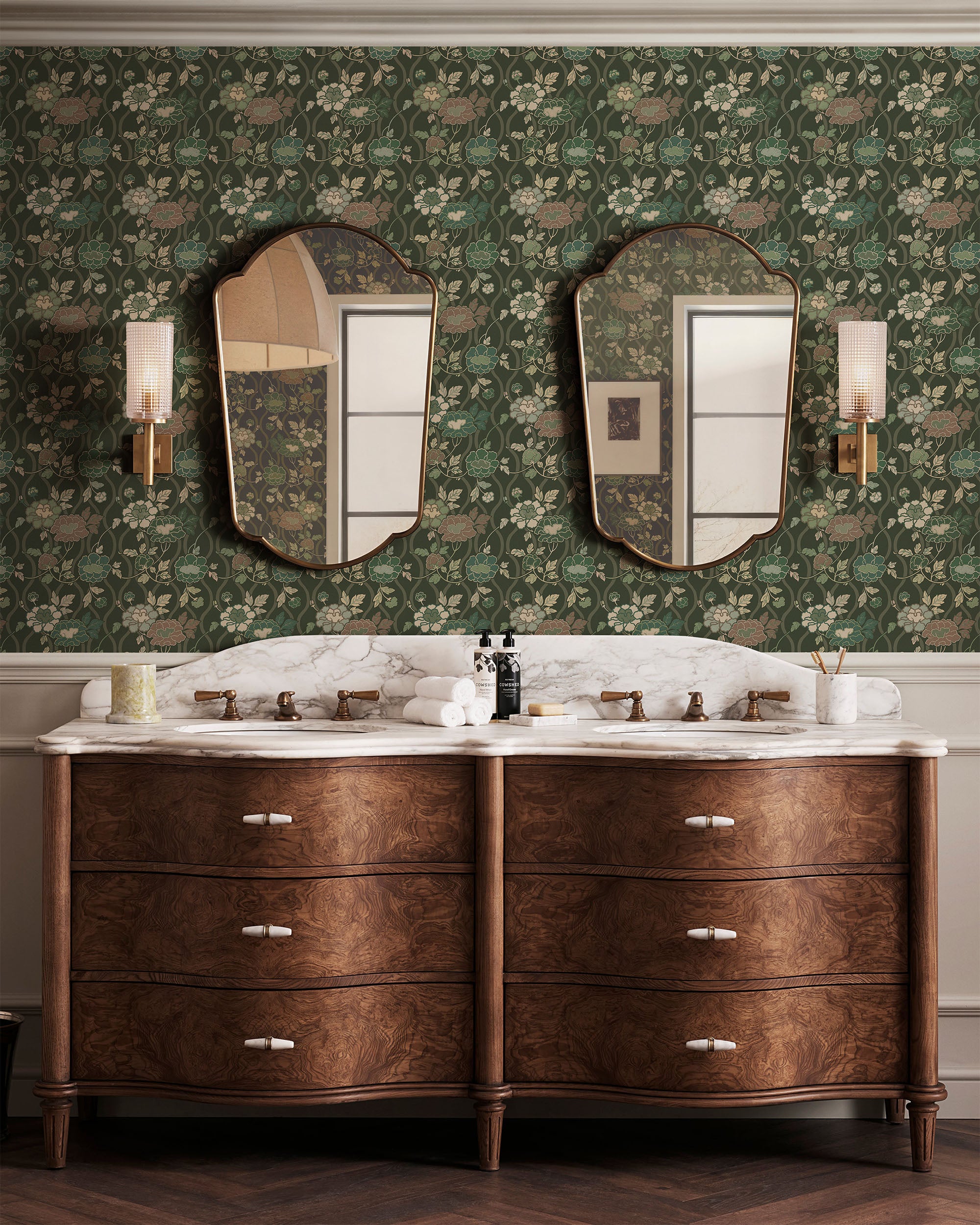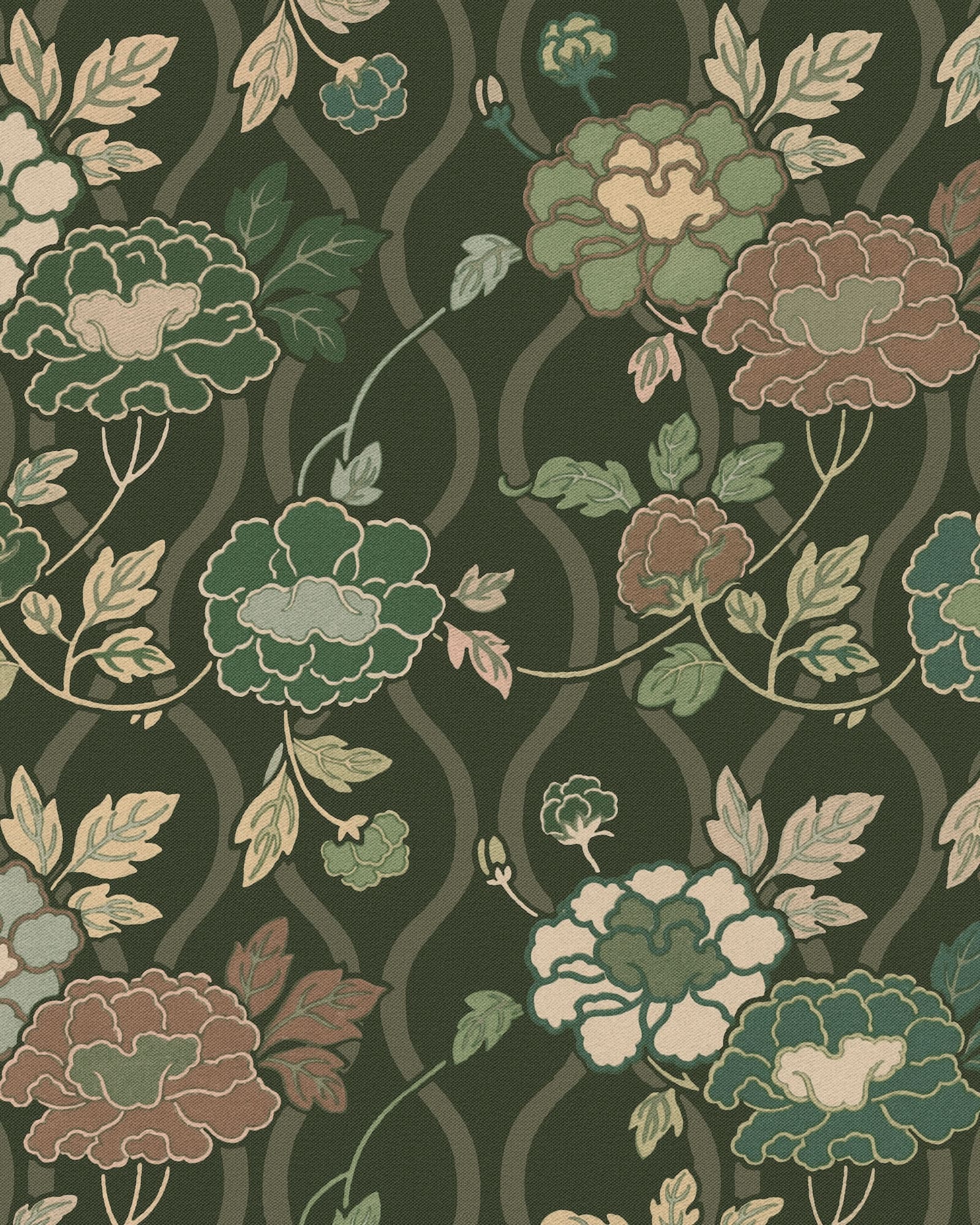 Seraphina Wallpaper entwines floral bounty with serpentine geometry, conjuring a garden in eternal bloom. Bold peonies and verdant ivy drift across scalloped trellises, blending vintage botanicals with the romantics of hand-embroidered textiles.