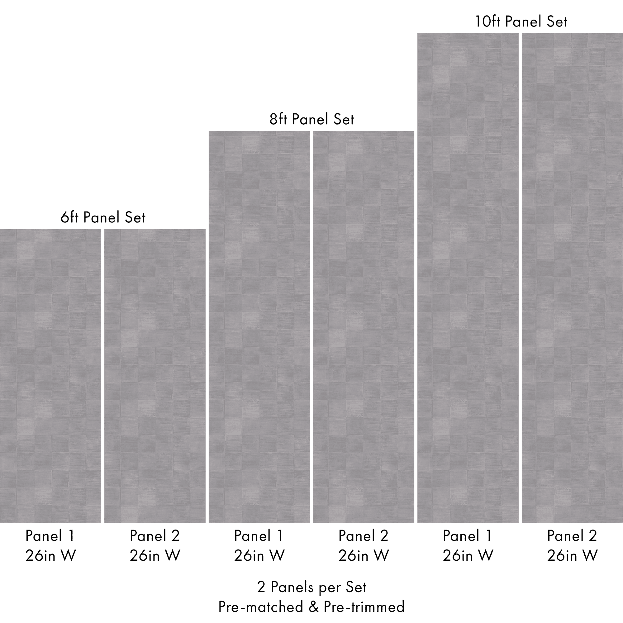 Each set includes 2 pre-matched and pre-trimmed panels designed for a seamless installation. Panels measure 26 inches wide and are available in 6 ft, 8 ft, or 10 ft lengths. For custom sizing, please contact us.