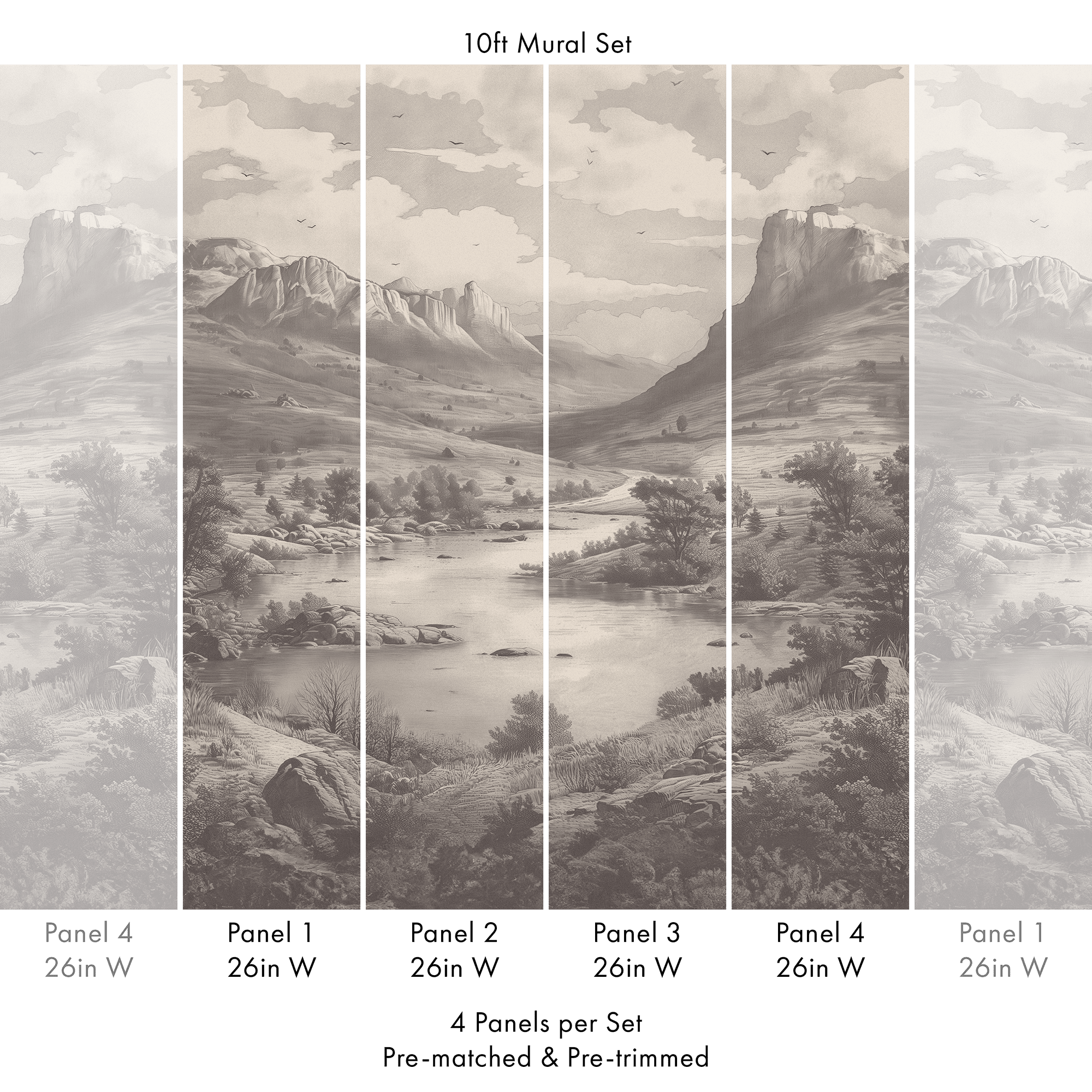 This mural is produced and sold in a pre-matched & pre-trimmed 4-panel set. Total mural width 104in (264cm).