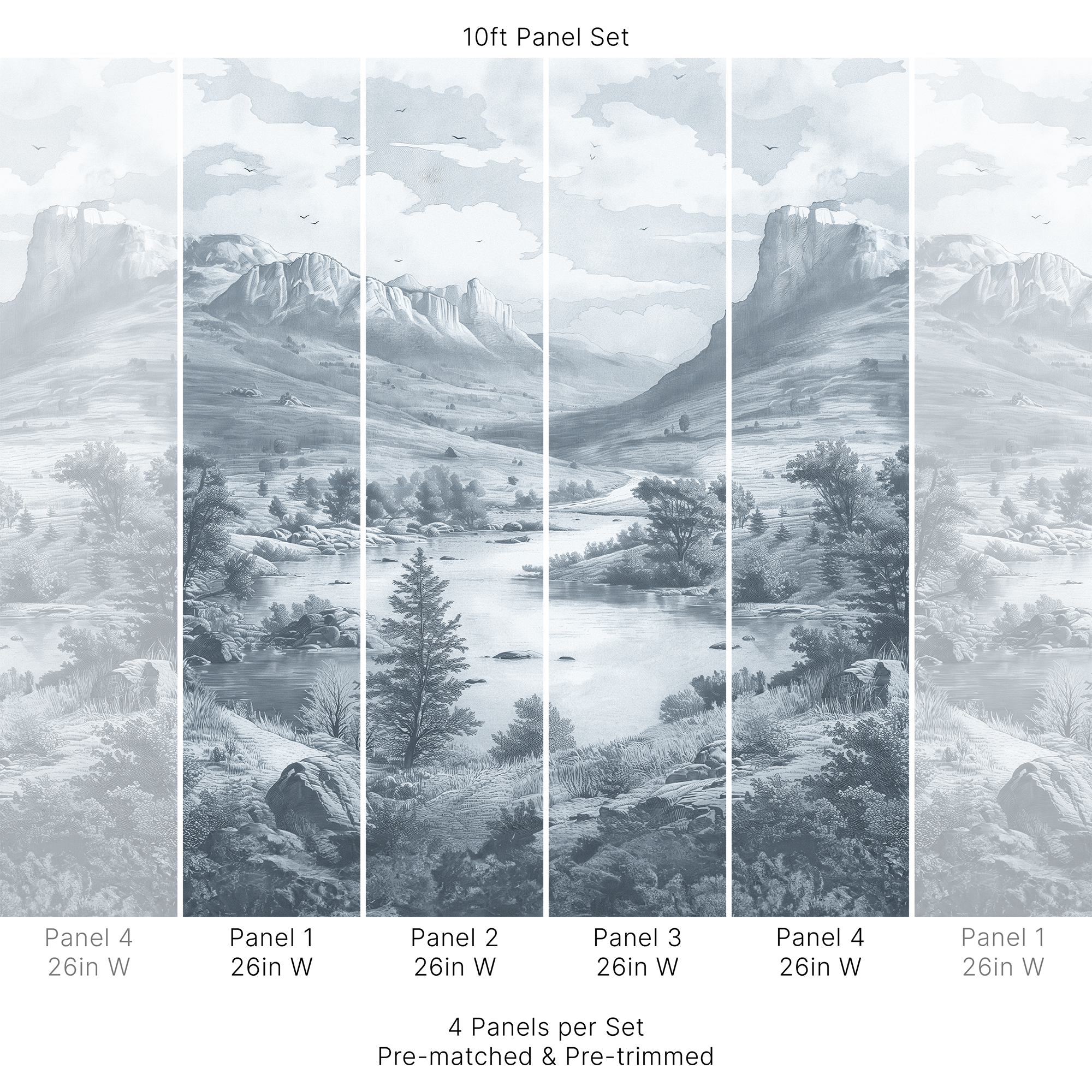 Valley Wall Mural depicts a serene morning along the uncharted frontier through hand-drawn illustrations of a lush river valley. This expansive mural brings the peacefulness of the outdoors inside, enveloping walls in the soft bustle of nature's splendor.
