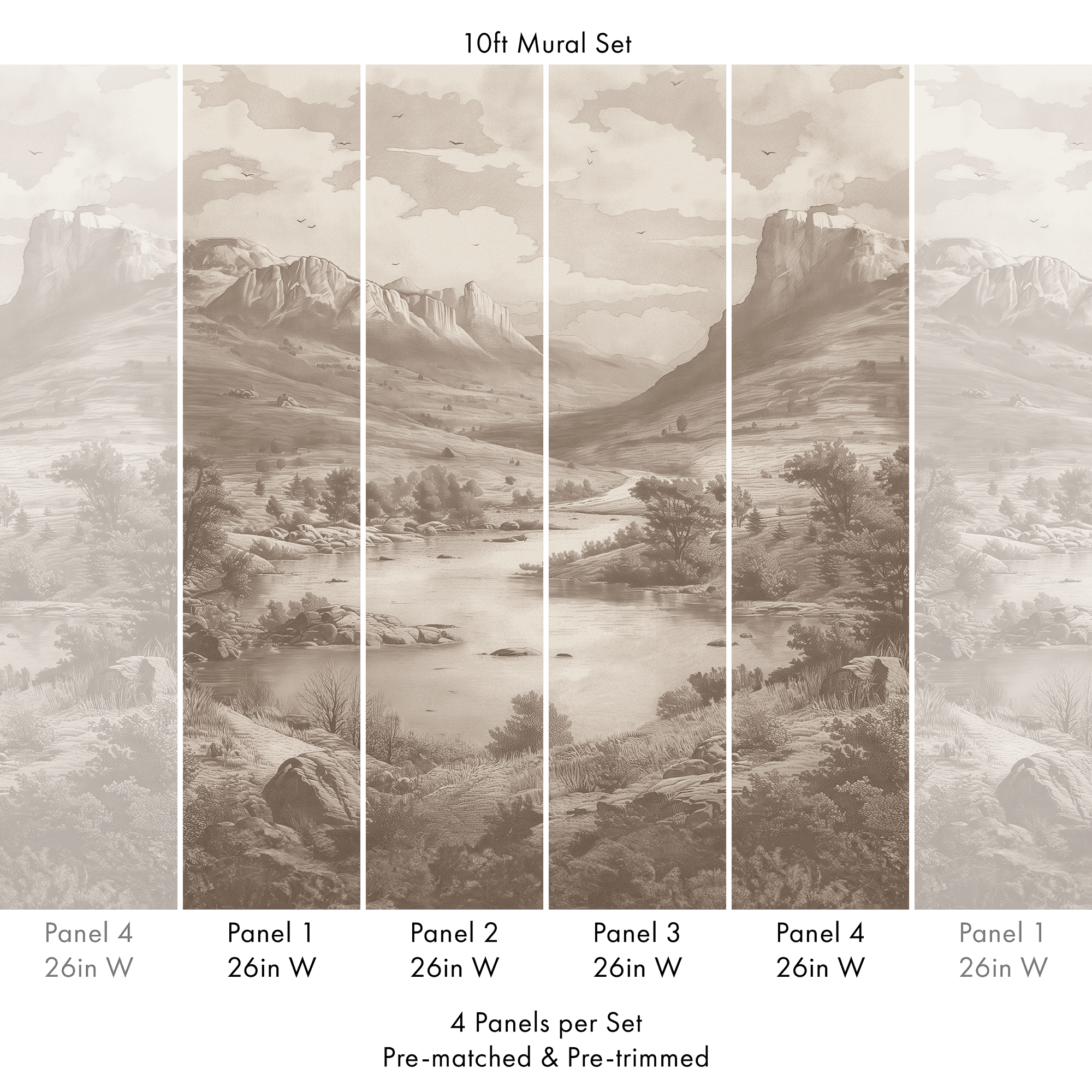 Valley Wall Mural depicts a serene morning along the uncharted frontier with hand-drawn illustrations of a lush river valley. This expansive mural brings the peacefulness of the outdoors inside, enveloping walls in the soft bustle of nature's splendor.