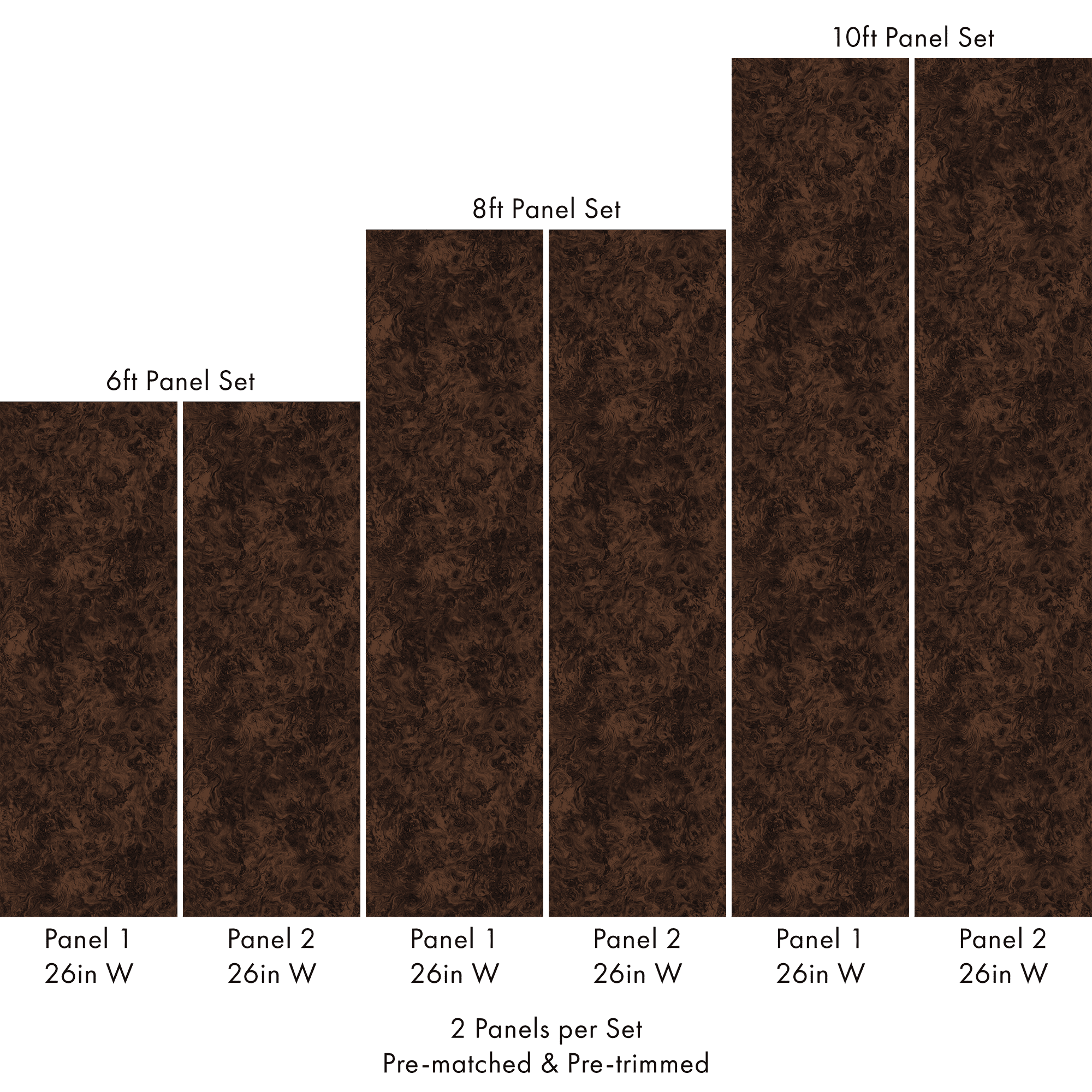 Each order includes 2 pre-matched, pre-trimmed panels designed for a seamless installation. Panels measure 26 inches wide and are available in 6 ft, 8 ft, or 10 ft lengths. For custom sizing, please contact us.