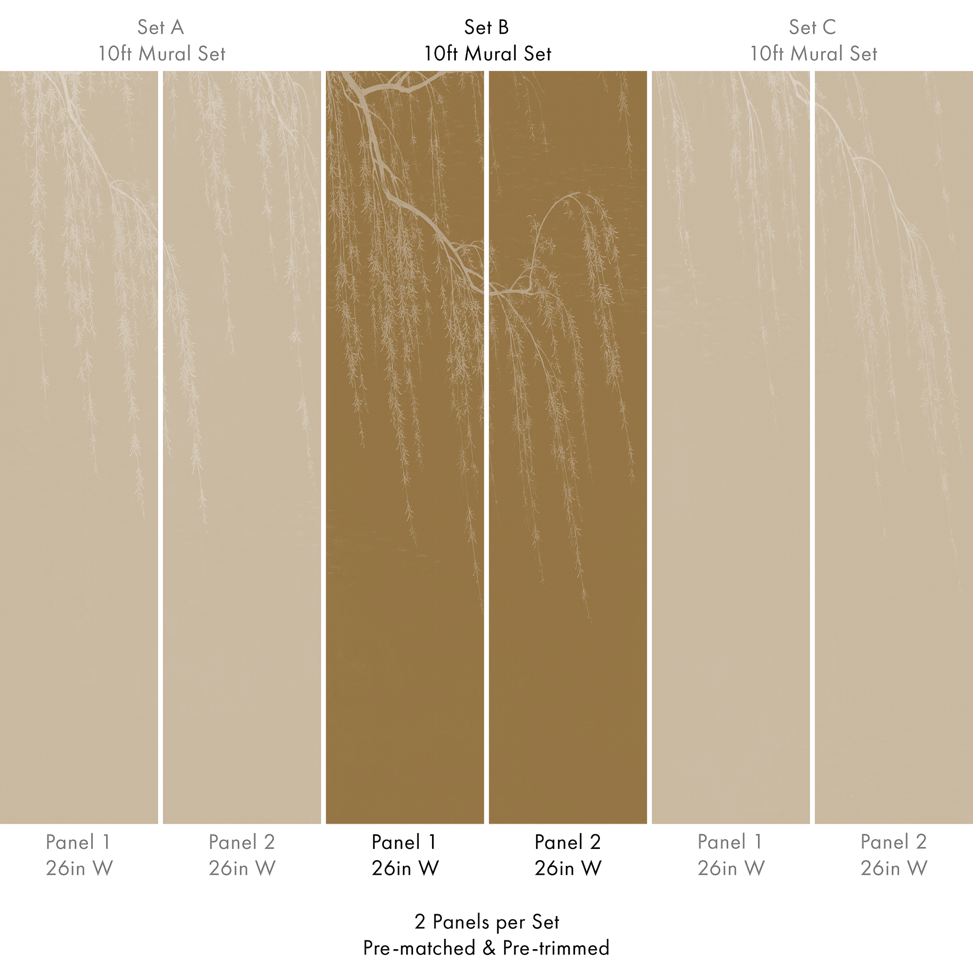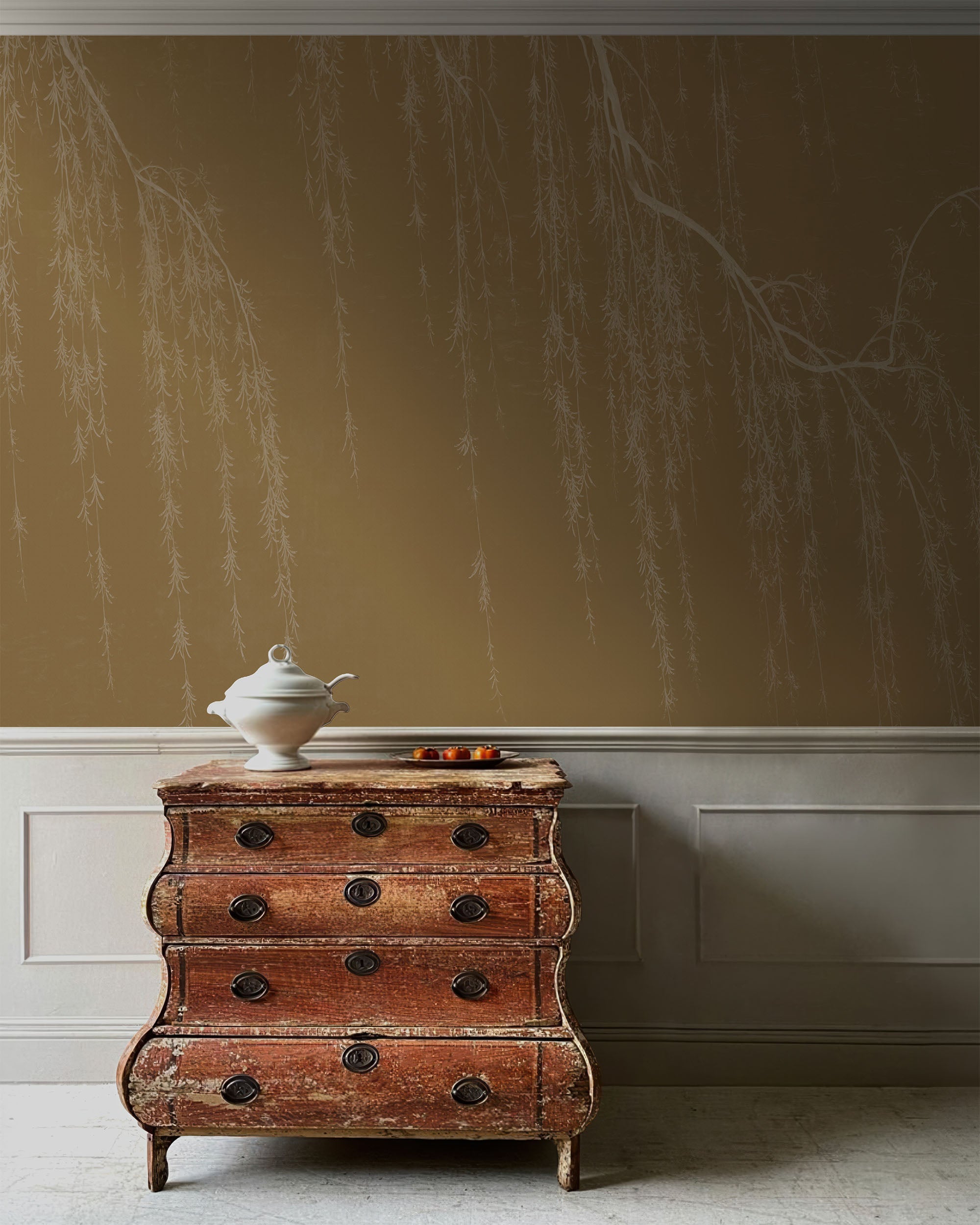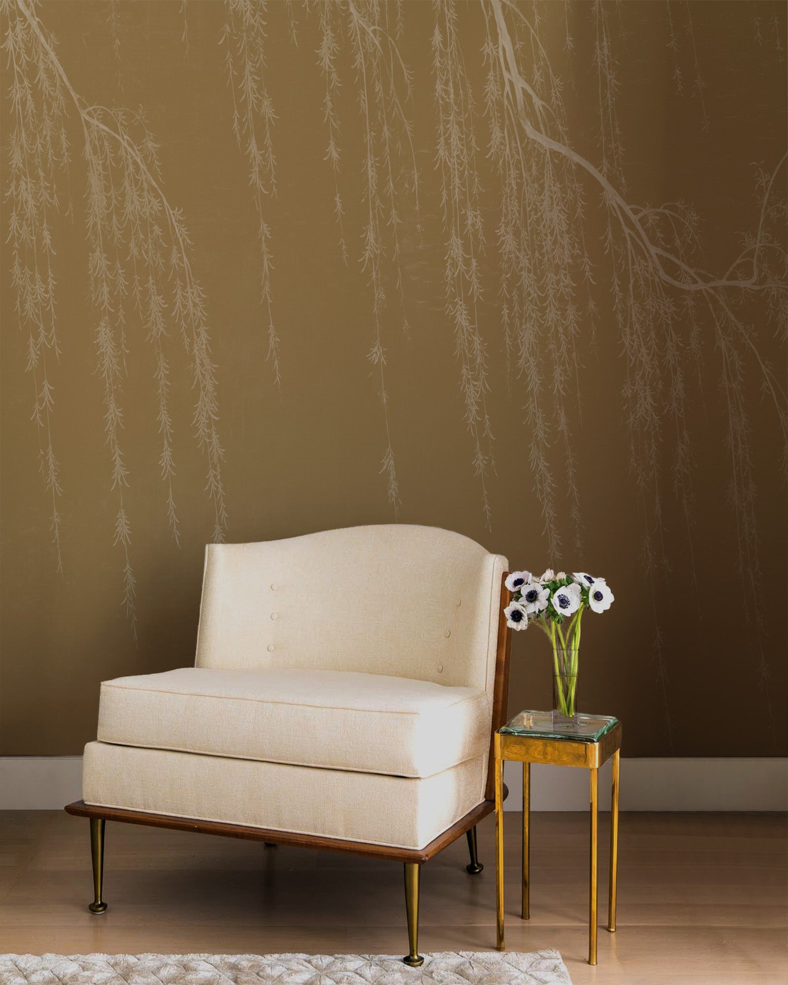 Our Willow Wall Mural gently cascades with ethereal, hand-painted branches, gracefully suspended like a poetic whisper on rich, metallic grounds. Evocative of quiet contemplation amid serene gardens, each sweeping brushstroke creates a vast, tranquil tapestry.