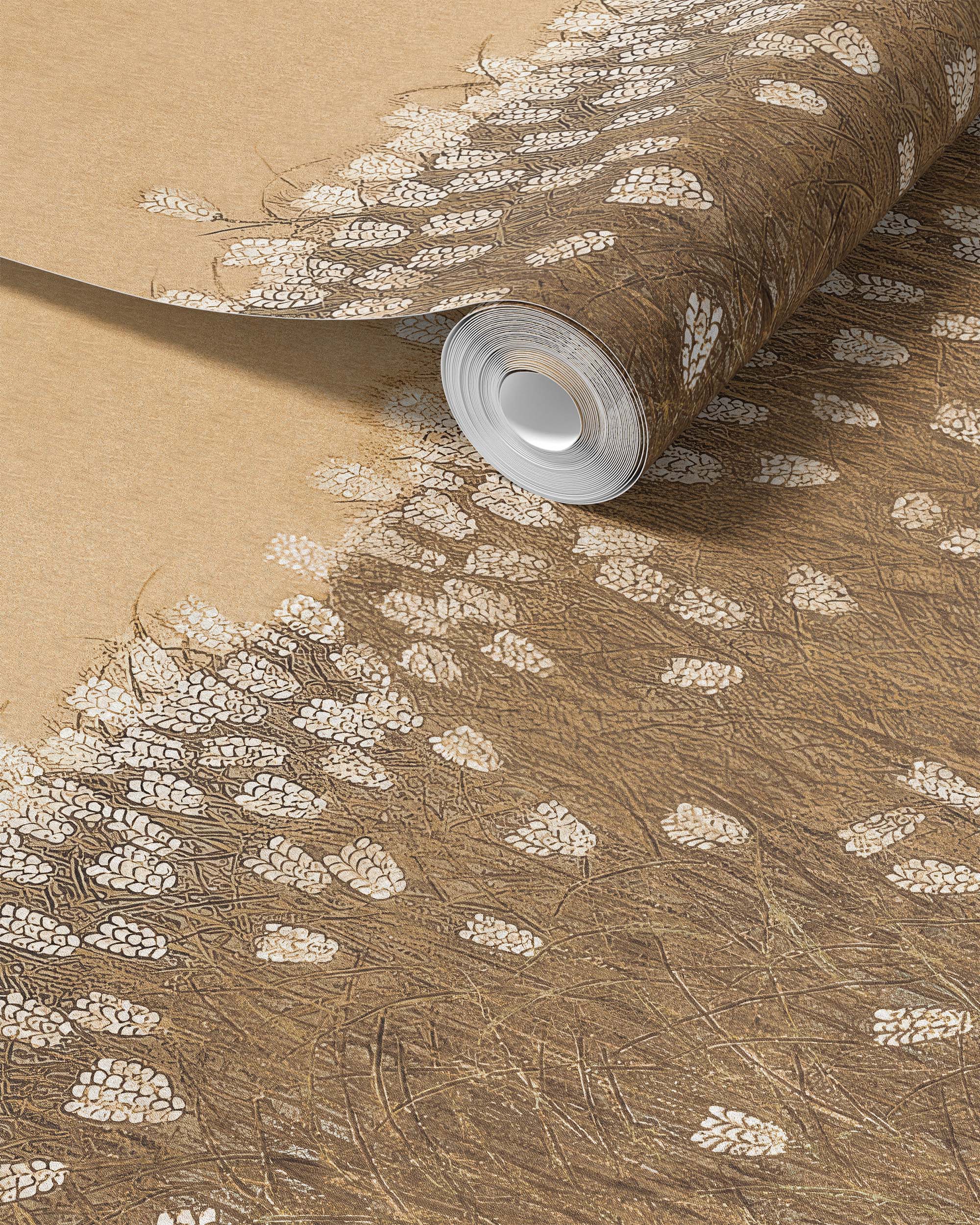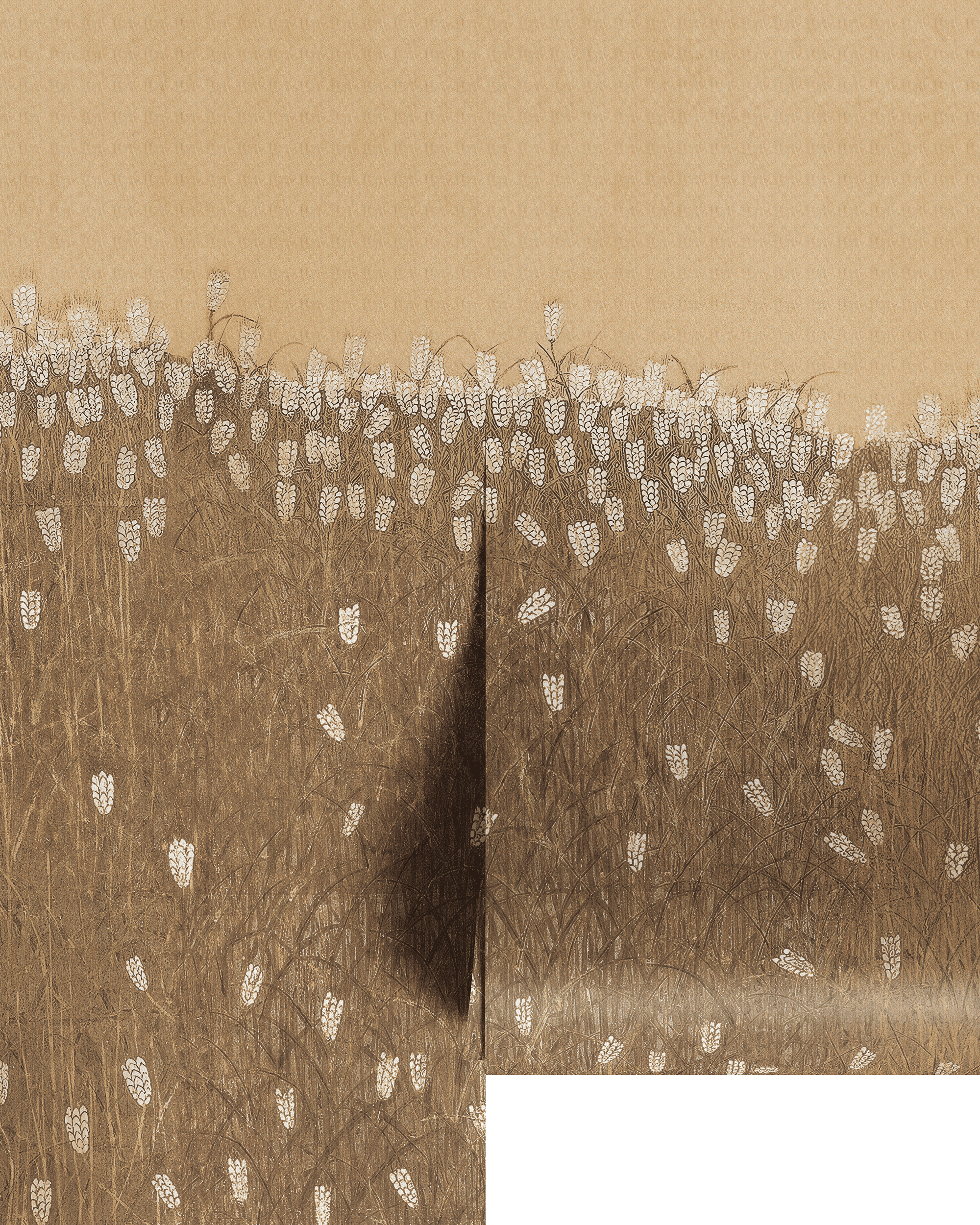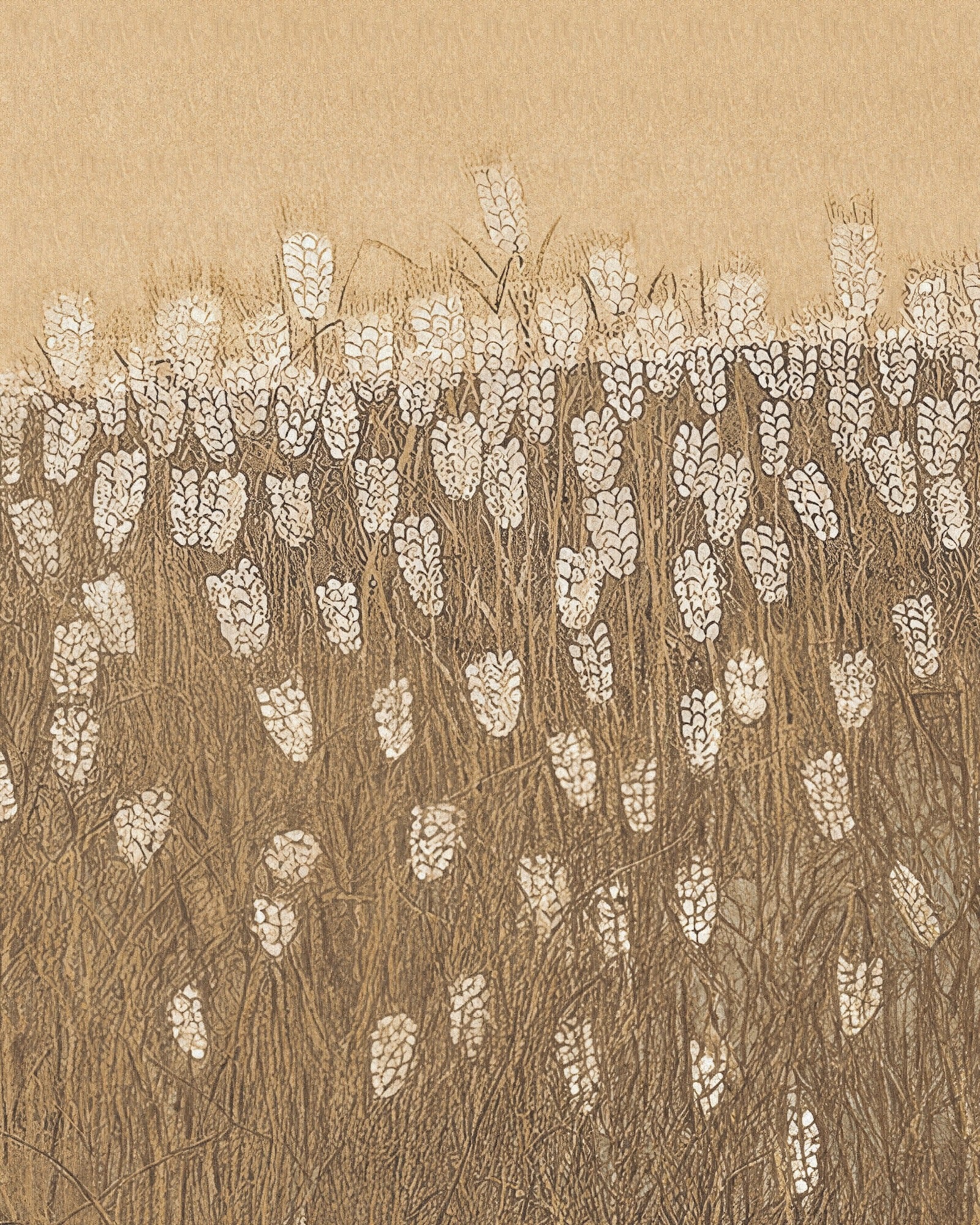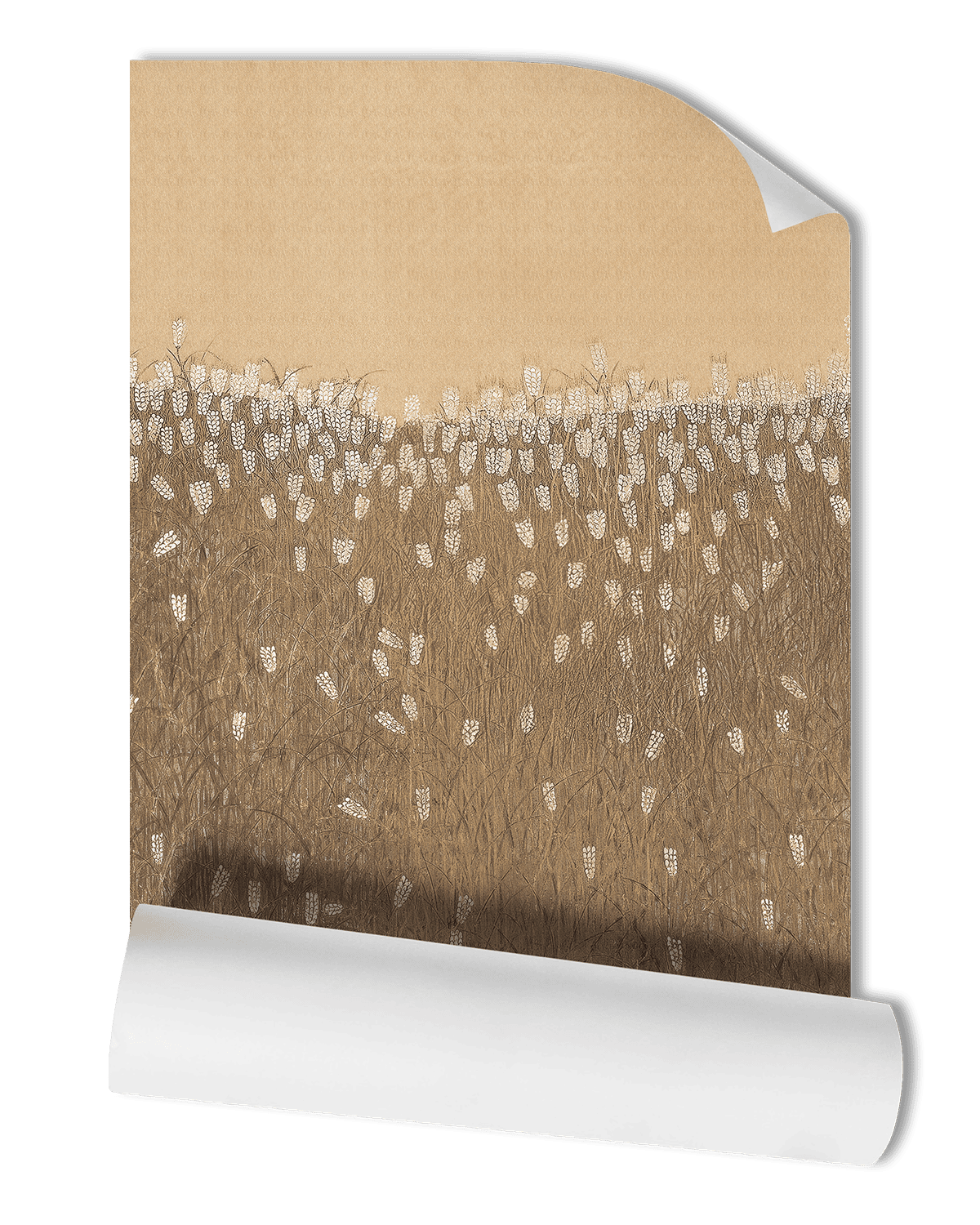 Barley Field Wall Mural captures the solitude of an autumnal field, where stalks sway in soft silhouettes against the romantic shimmer of an expansive sky. Its painterly texture and rising pattern recall traditional Japanese woodblock prints, inviting a sense of quiet rhythm and seasonal stillness.