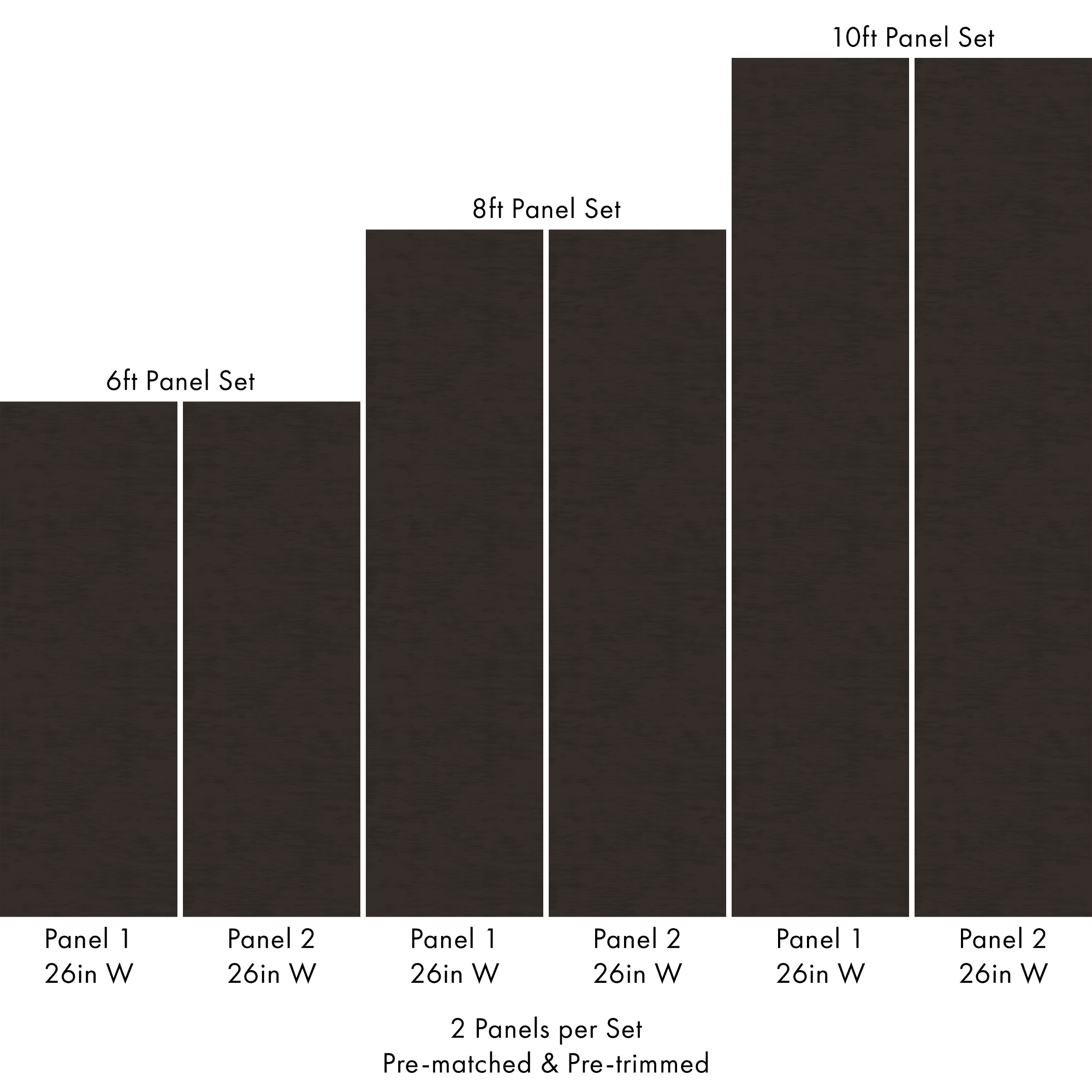 Each set includes 2 pre-matched and pre-trimmed panels designed for a seamless installation. Panels measure 26 inches wide and are available in 6 ft, 8 ft, or 10 ft lengths. For custom sizing, please contact us.