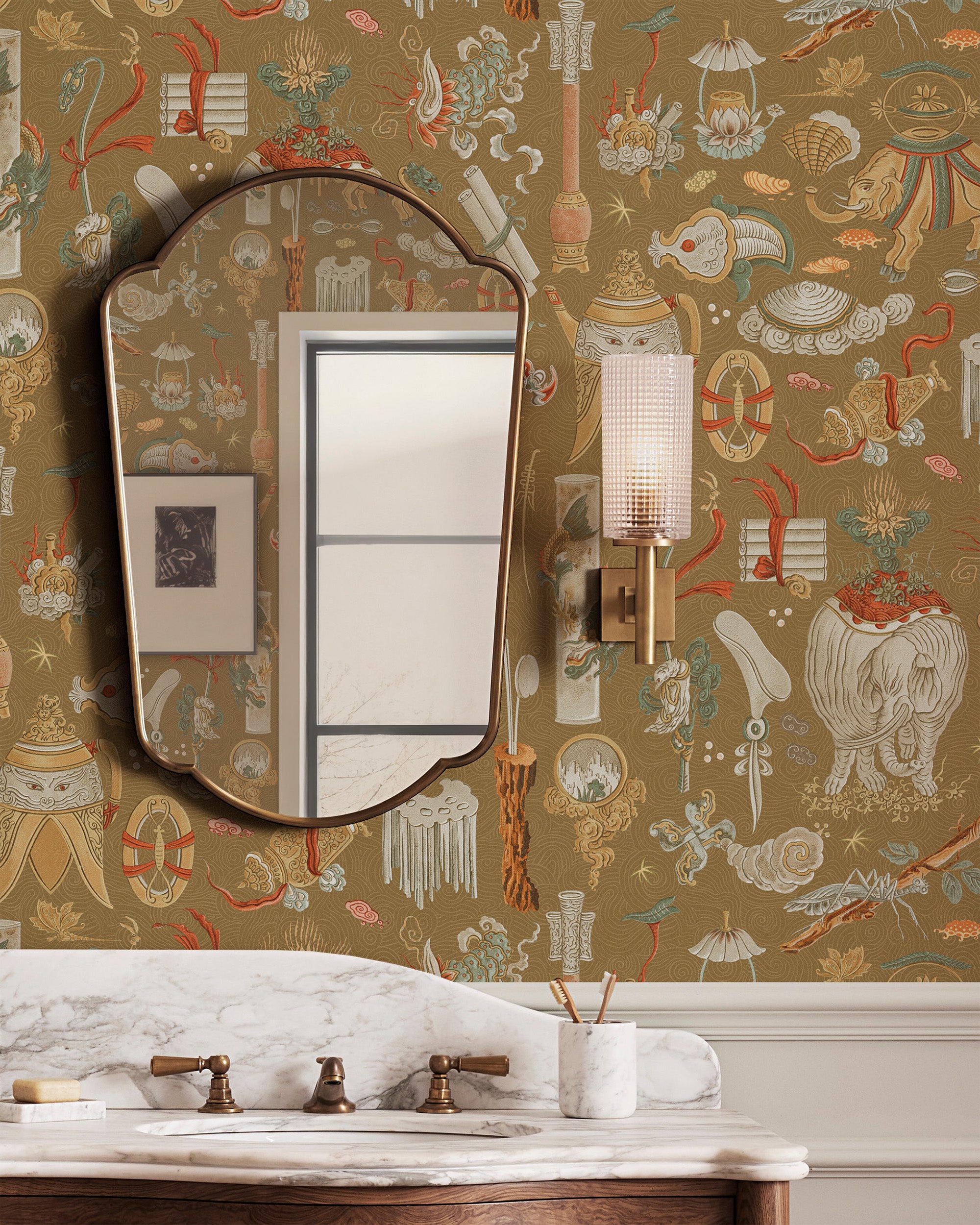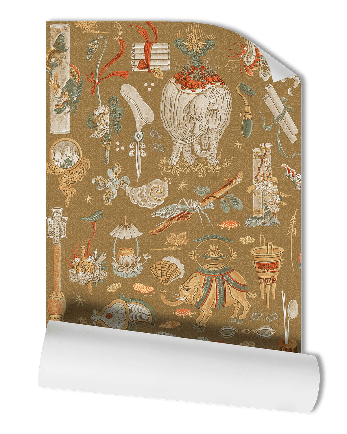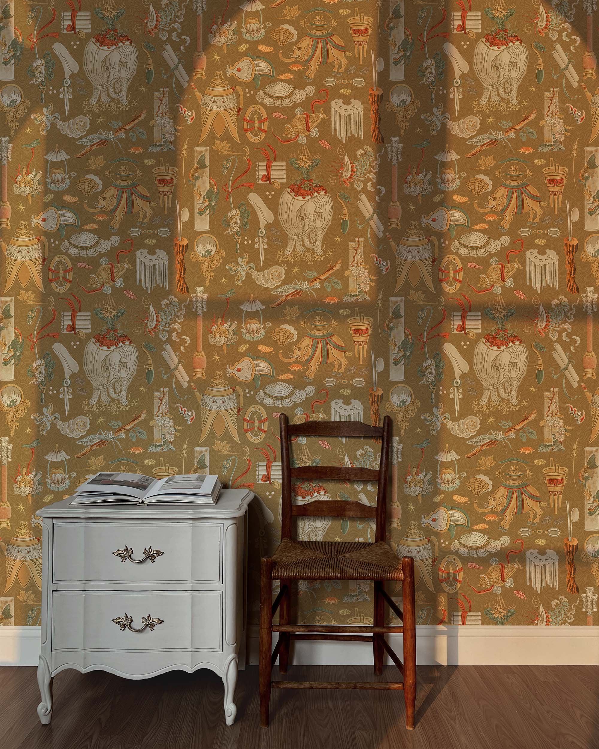 Celestial Curiosities Wallpaper reads like a richly fabled scroll—each element a relic of nature, myth, and wonder suspended in mystical motion. Lose yourself in a fantastical menagerie as storied insects, gilded objects, and sacred creatures drift across a hypnotic, swirling sky.