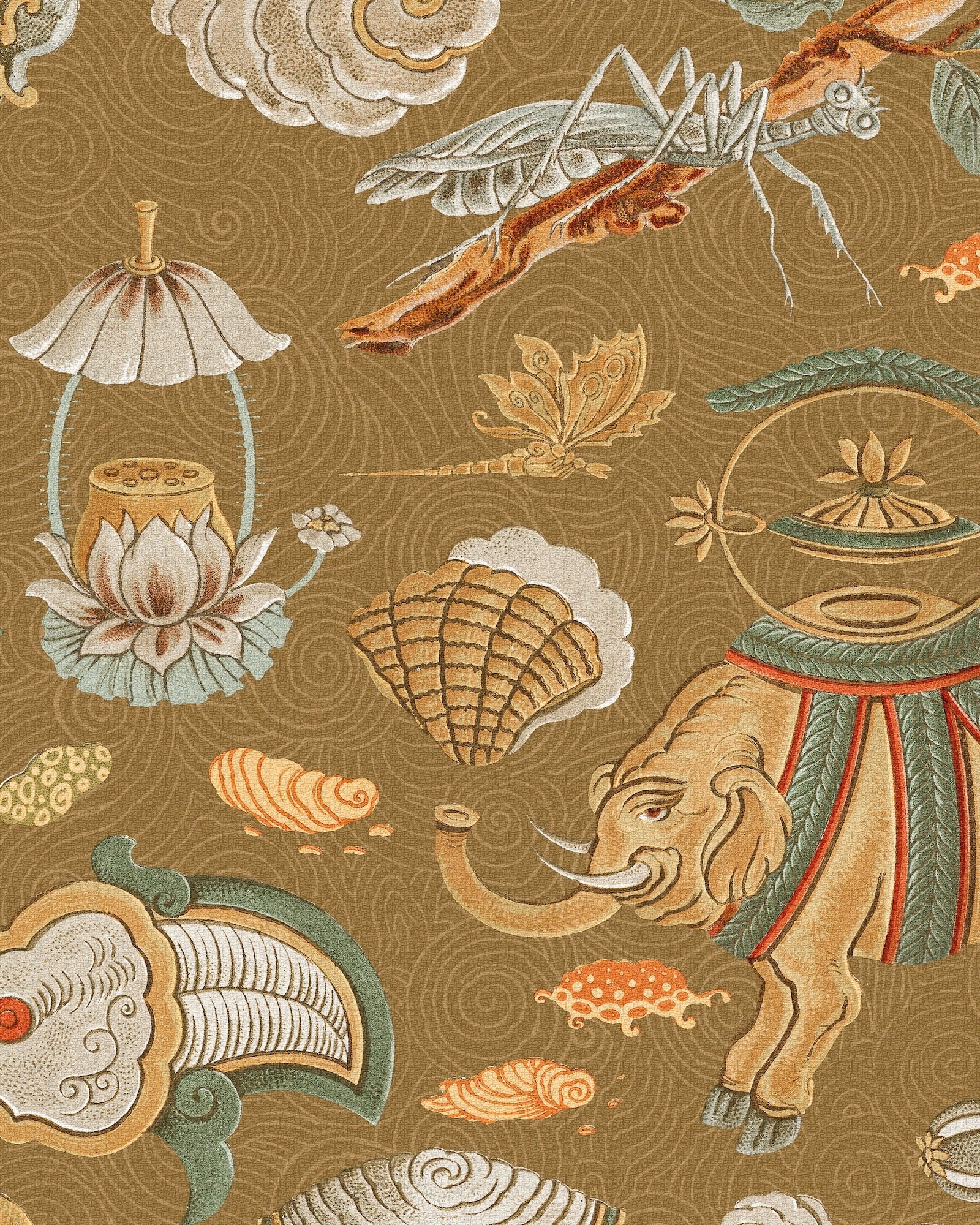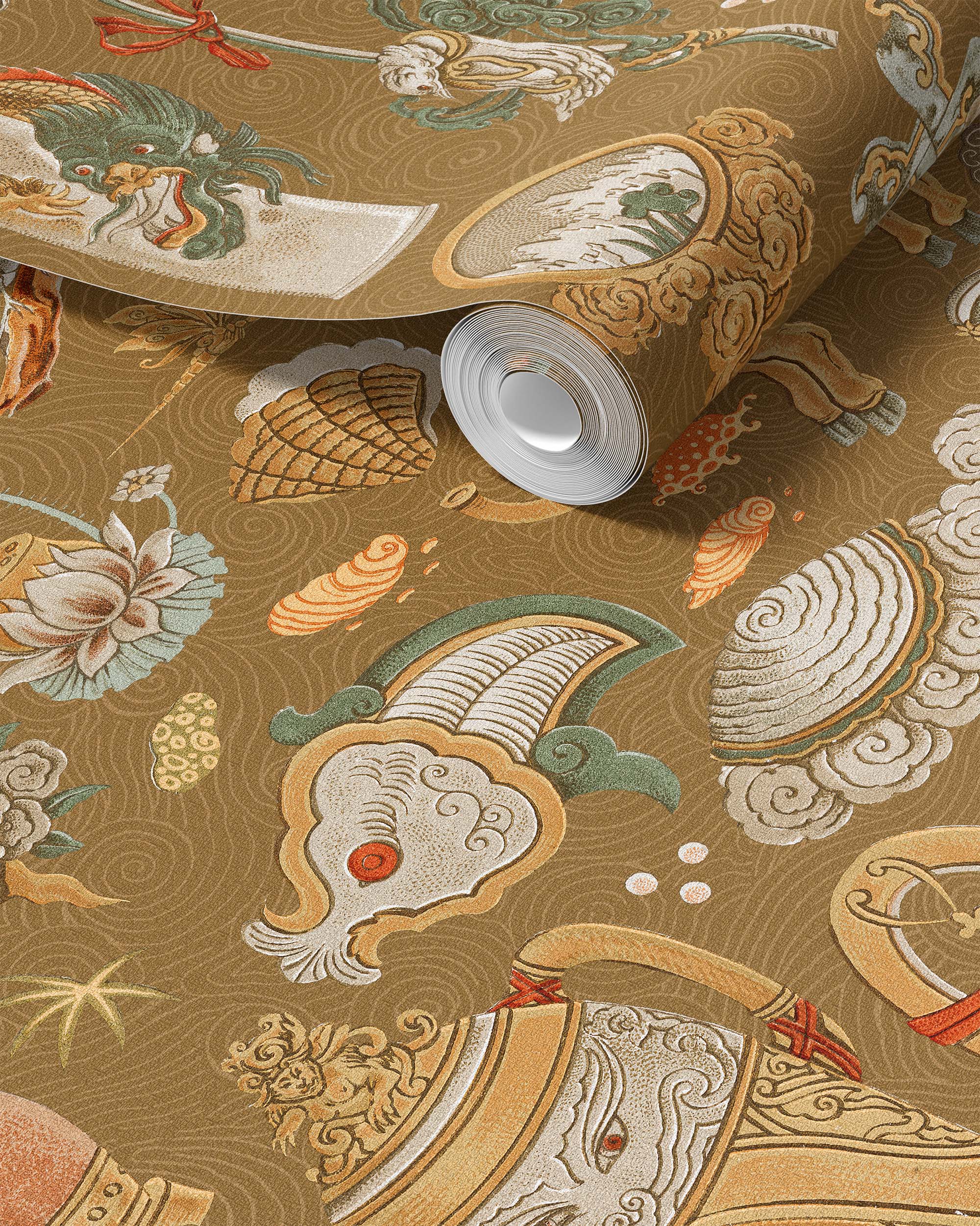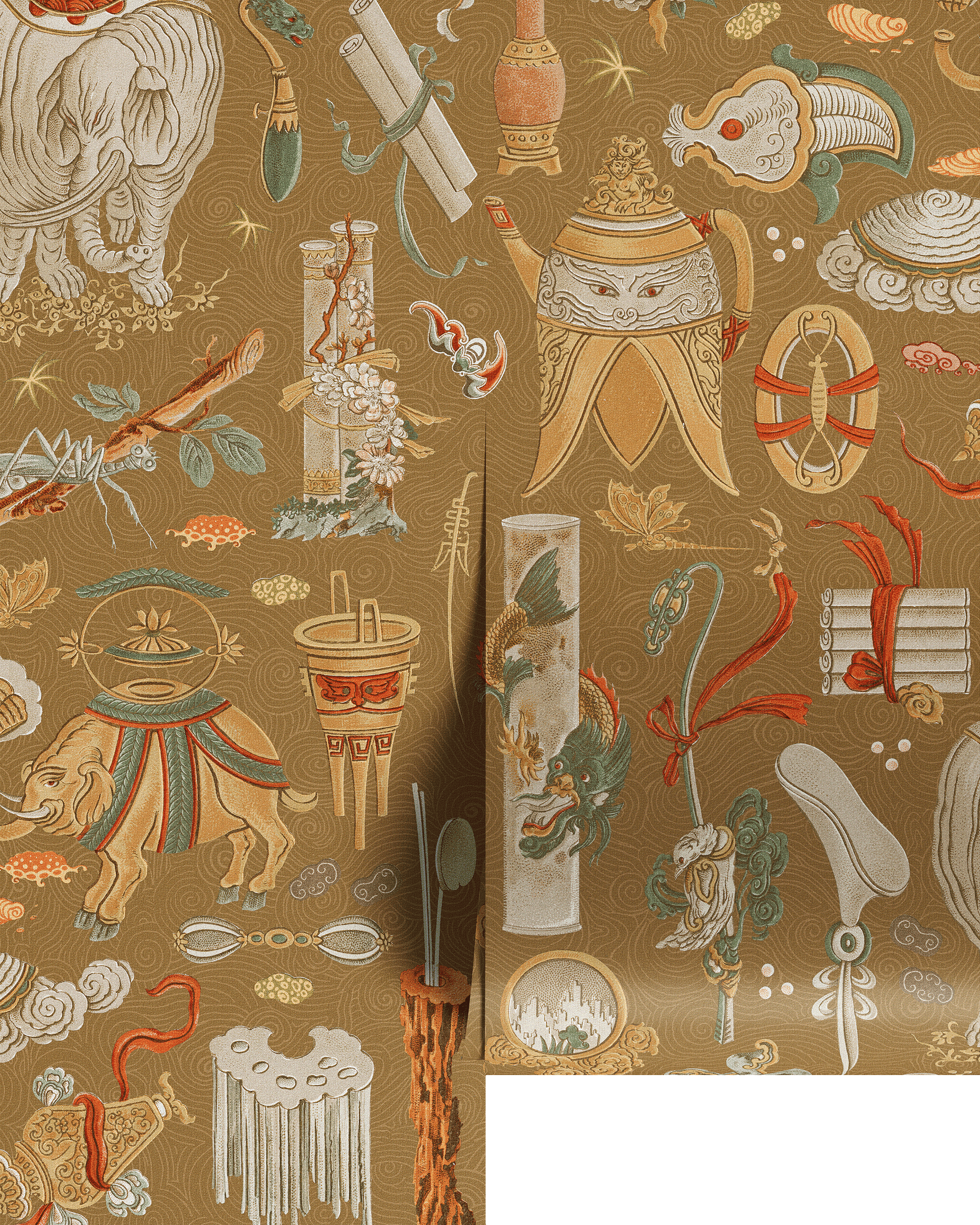 Celestial Curiosities Wallpaper reads like a richly fabled scroll—each element a relic of nature, myth, and wonder suspended in mystical motion. Lose yourself in a fantastical menagerie as storied insects, gilded objects, and sacred creatures drift across a hypnotic, swirling sky.
