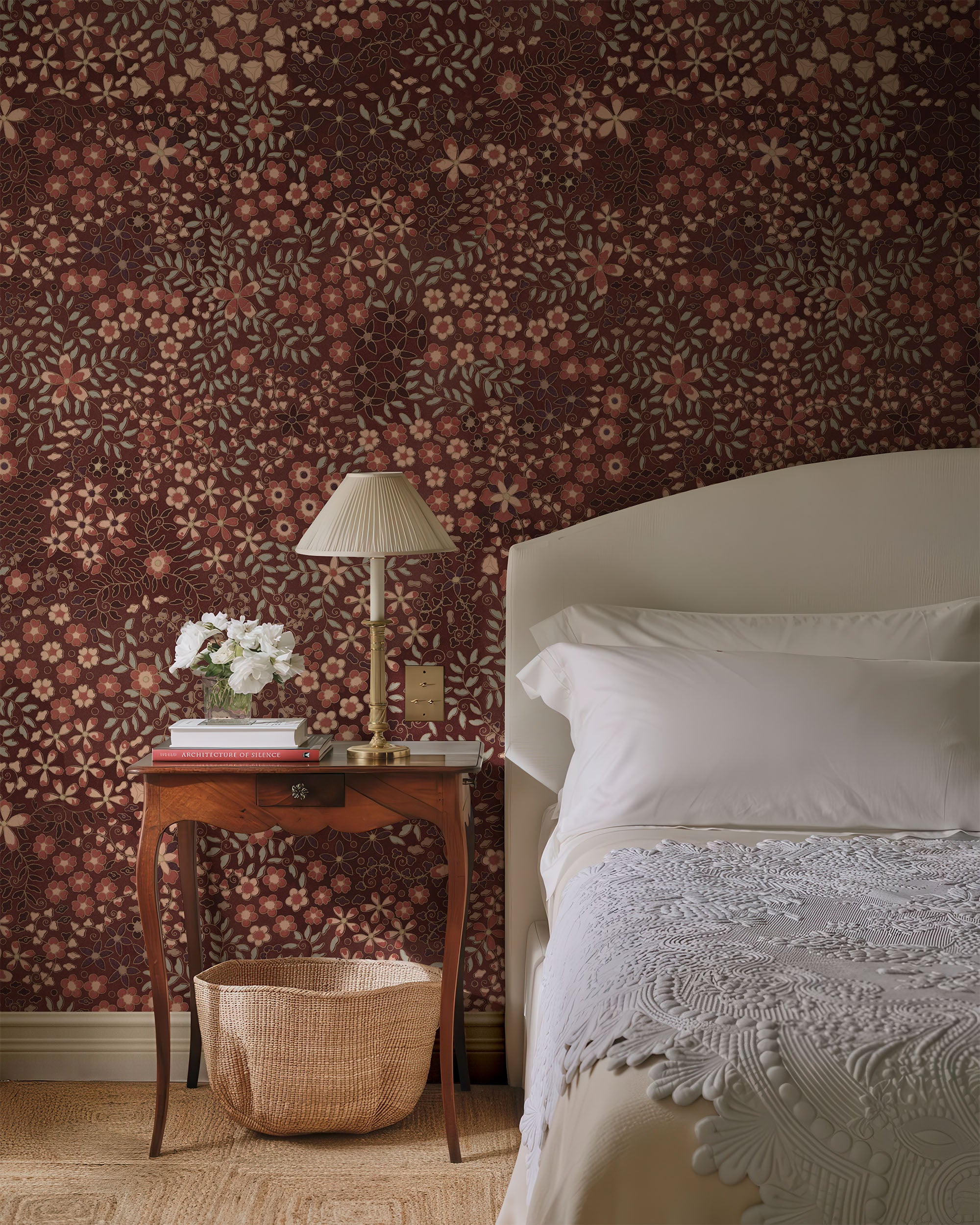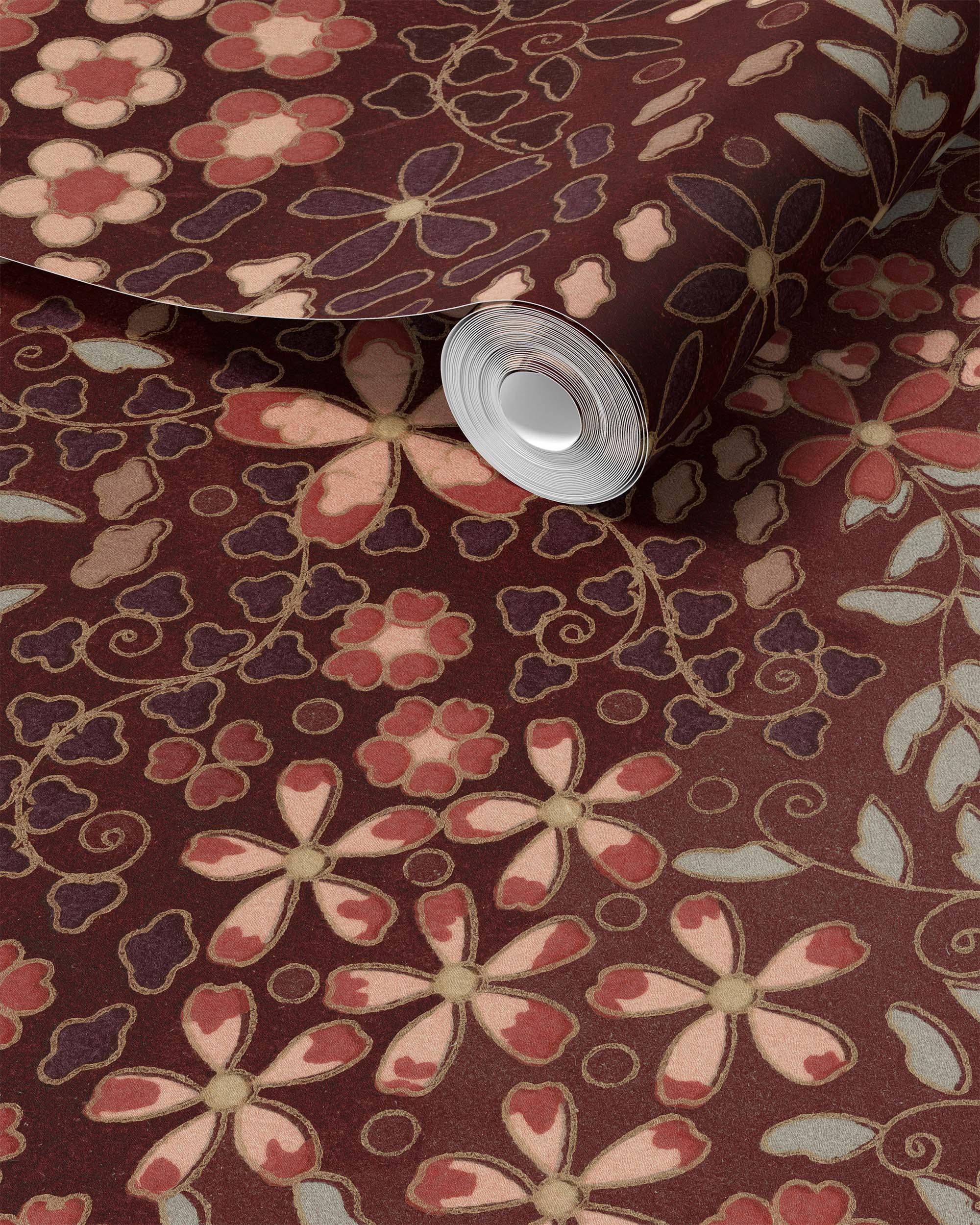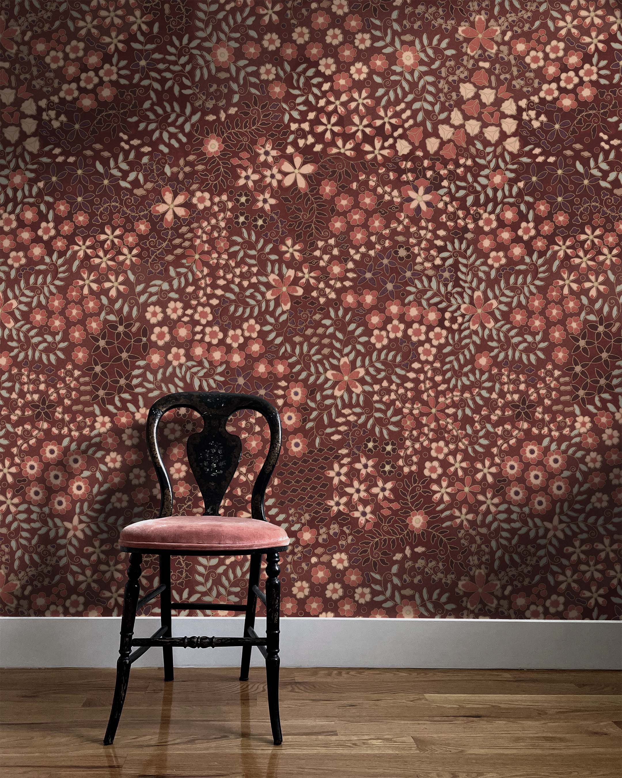 A garden in eternal bloom, Eden Wallpaper conjures a cascade of stylized florals that drift and spiral across an ornamental ground. Inspired by antique Japanese silks and sacred embroidered textiles, this pattern is both lush and lyrical — a reverie mastered in a serpentine repeat.