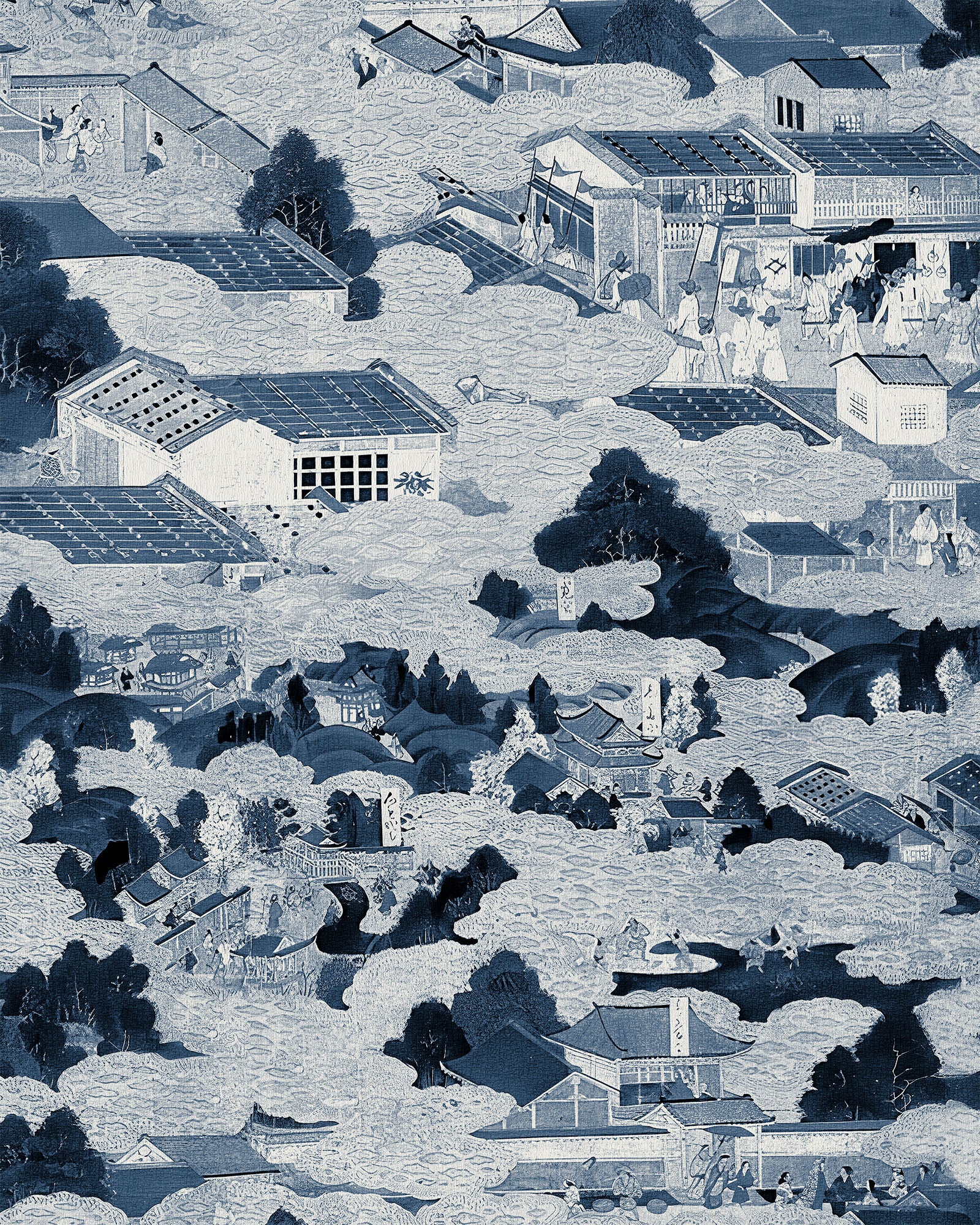 An ethereal landscape of rooftops and trees unfolds in quiet rhythm, capturing the layered charm of bustling Edo-period Japan. Edo Village Wallpaper invites you to wander through a floating world of temple eaves, lively courtyards, and mist-draped gardens — each shimmering vignette a story etched in time.