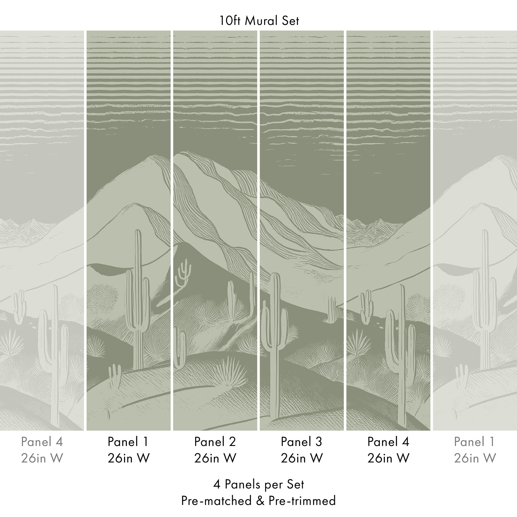 Southwest Wall Mural showcases a tonal desert oasis with hand-drawn saguaro cacti, soft grasses, and sweeping vistas. This expansive mural was inspired by vast natural landscapes of the American West with nods to desert mid-century modern design.